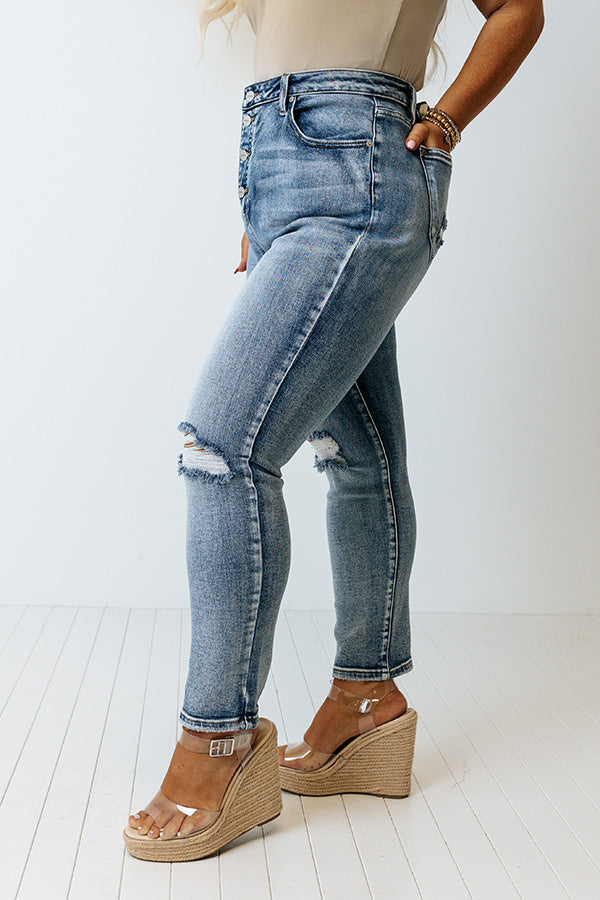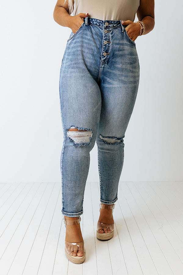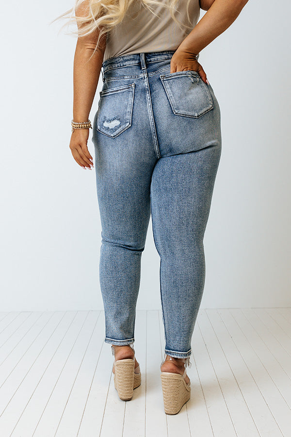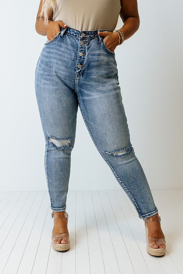 Our trendy plus size 'Carmella' skinny is the upgrade your wardrobe denim has been asking for with its lightweight medium wash denim material, distressed detailing and accent fading, high waistline with belt loops and a four button closure, classic four-pocket cut, and flattering figure hugging silhouette that ends in straight ankle-length hemlines!