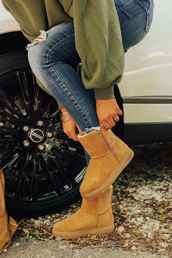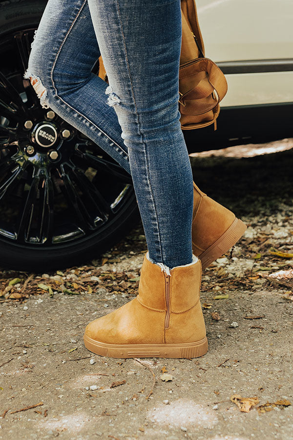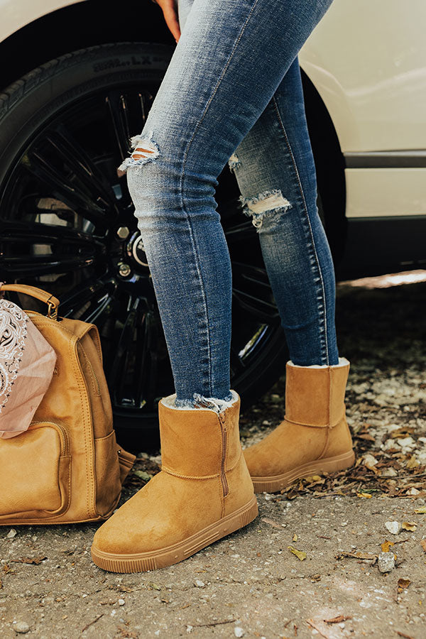 Welcome the colder months in style with our cozy but practical tan colored 'Cassie' boot featuring faux suede material with faux fur lining, a rounded open toe, a flat sole, and an outside zip closure! This boot runs more true to size.