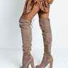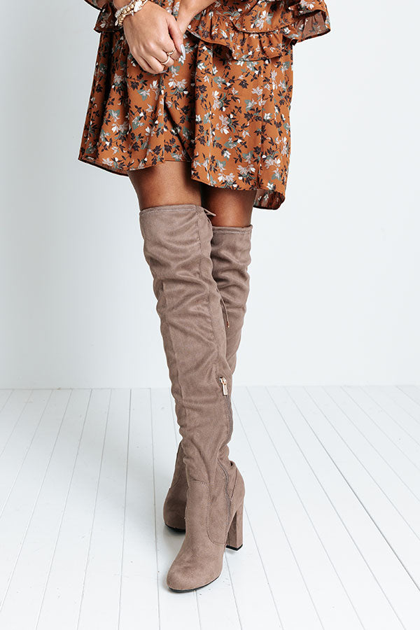 No better boot was made for walking than our trendy taupe colored 'Charleston' boot featuring faux suede material, a rounded closed toe, a 4-inch block heel, an inside ankle zip closure, a 13-inch circumference, and a thigh high silhouette with a tie closure! This boot runs more true to size.