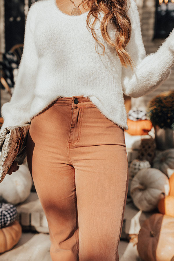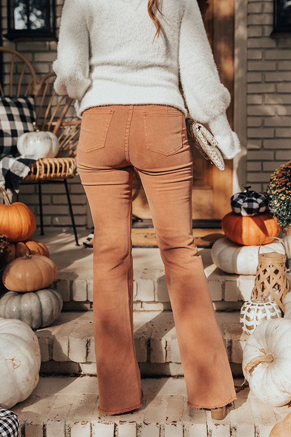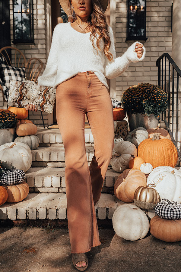 You are sure to love "The Charli" pants featuring a light rust color, a wide banded high waistline, two pocket cuts, a hidden zip with a button closure, and stretchy, figure flattering fit that leads into a trendy and flared raw hem cut! These trendy bottoms will take you from season to season when you wear with your favorite open toed heel and tank top in the summer and with booties and a sweater in the fall!