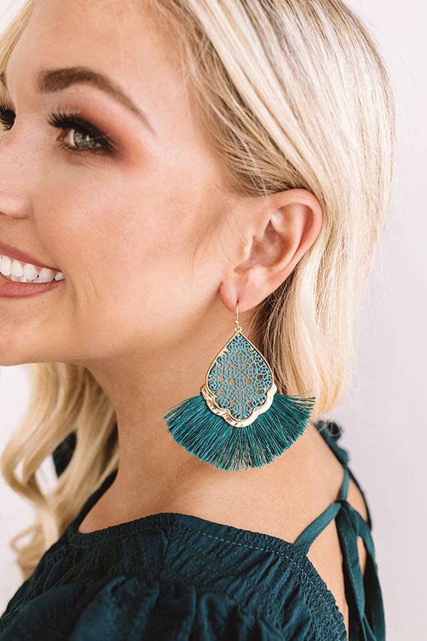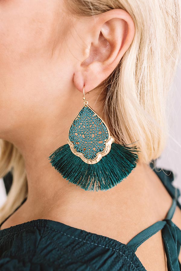 Glam up your OOTD with "The Charmed Life" statement earrings featuring intricate metal detailing set inside dangling gold abstract teardrops with a hunter green hued tassel fans!