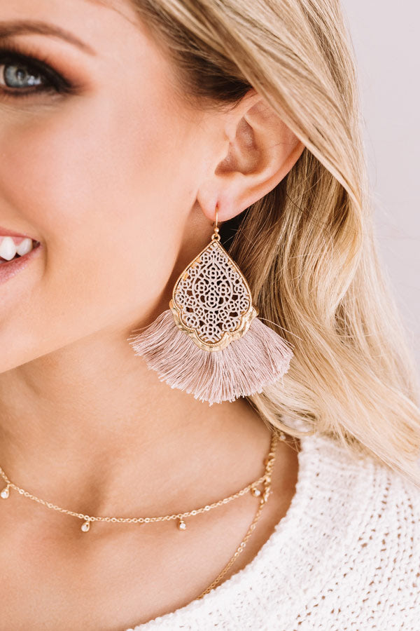 Glam up your OOTD with "The Charmed Life" statement earrings featuring intricate metal detailing set inside dangling gold abstract teardrops with a taupe hued tassel fans!