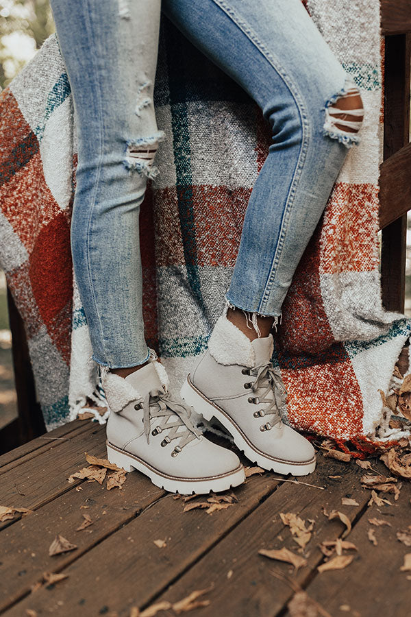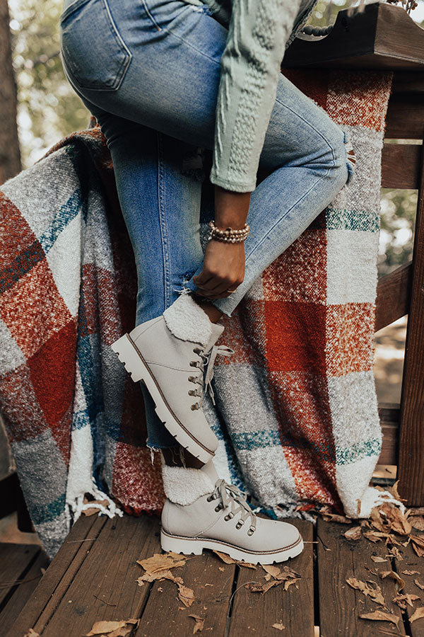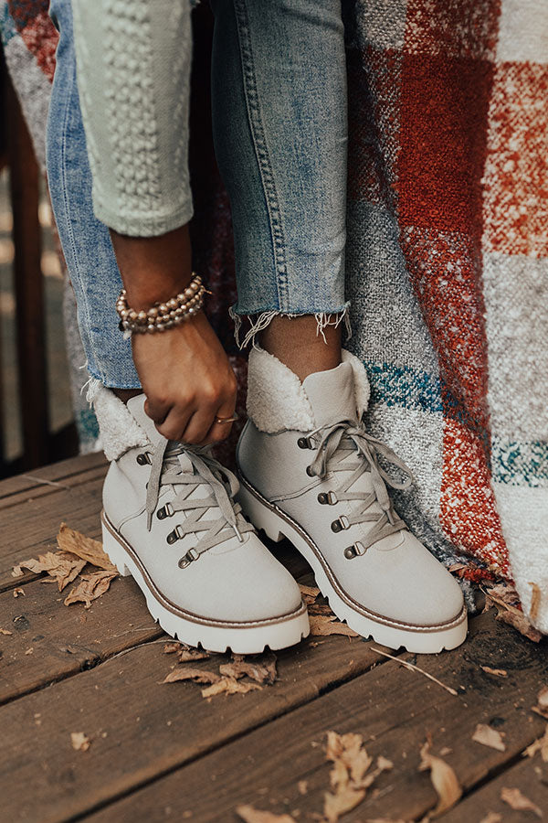 There is no better shoe to dress up or down than our trendy grey 'Chase' boot featuring faux suede material, a rounded closed toe, sherpa lining around the ankles, a 1.5-inch heel height, and a lace-up silhouette! We recommend a 1/2 size up if in between sizes and/or for thicker socks to be comfortable worn.