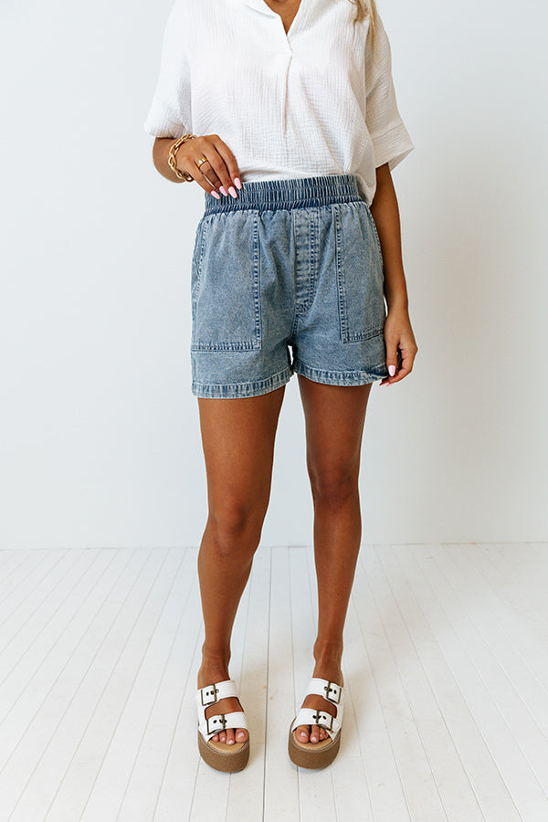 Our cute light wash 'Chelsie' shorts feature lightweight mineral wash material, a high elastic waistline, two side pockets and two back pocket cuts, and a relaxed silhouette that ends in straight upper-thigh length hemlines!
