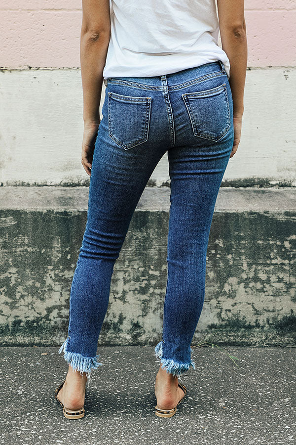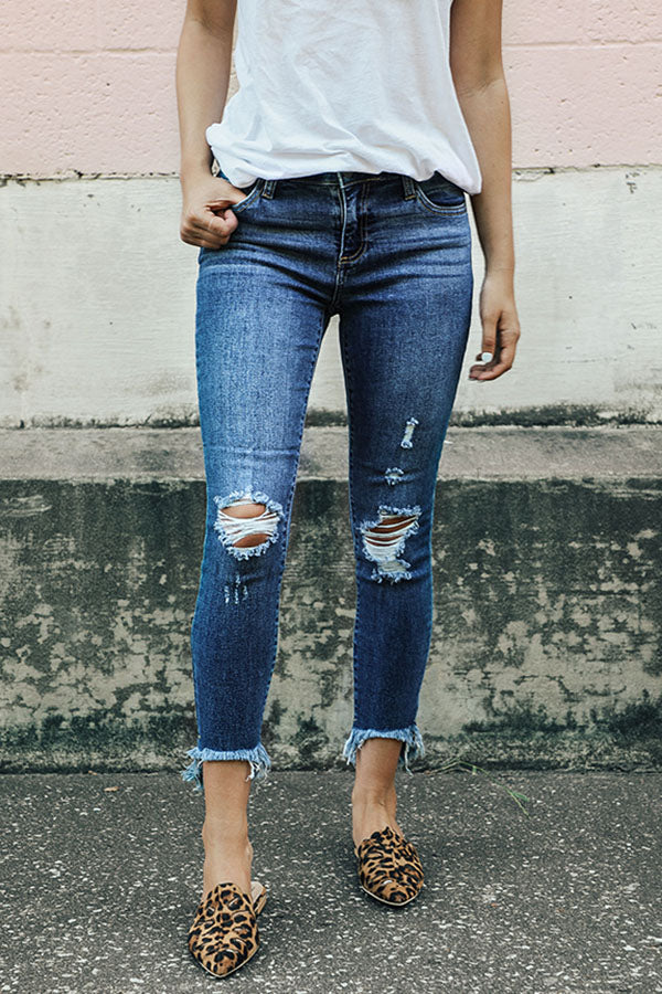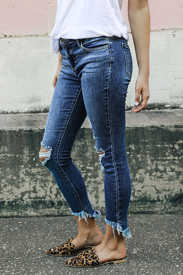 These medium wash distressed denim jeans have a mid-rise fit, distressed knees, a great stretchy fitted feel & a sleek skinny silhouette with a frayed high-low hem that hits right above the ankle.