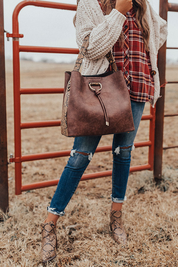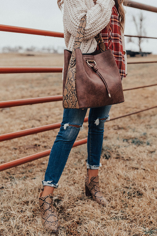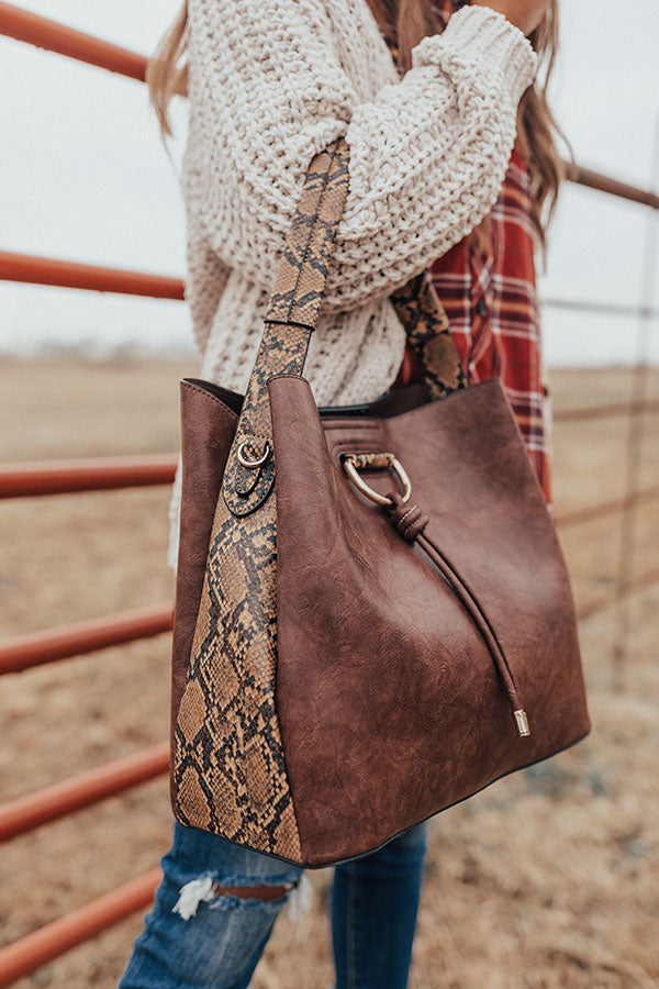 Handbags speak louder than words, especially when you accessorize with our chestnut colored "City Life" tote featuring sleek faux leather material, a brown and neutral hued snake print pattern on the side panels and single handle, an accent tassel, and a spacious fully lined square shaped pouch with a zip closure and additional inside pockets!