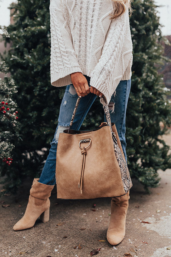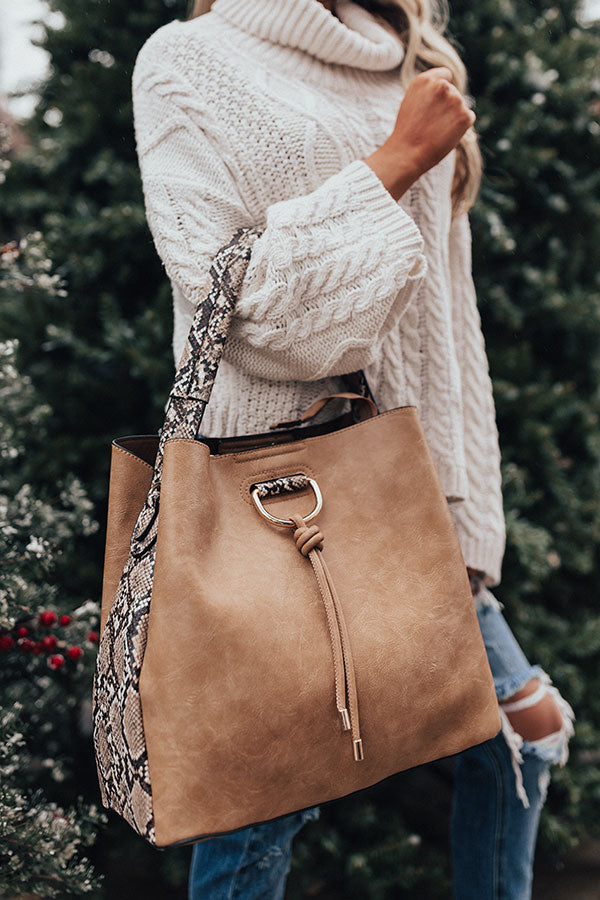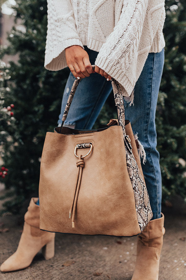 Handbags speak louder than words, especially when you accessorize with our tan colored"City Life" tote featuring sleek faux leather material, a brown and neutral hued snake print pattern on the side panels and single handle, an accent tassel, and a spacious fully lined square shaped pouch with a zip closure and additional inside pockets!