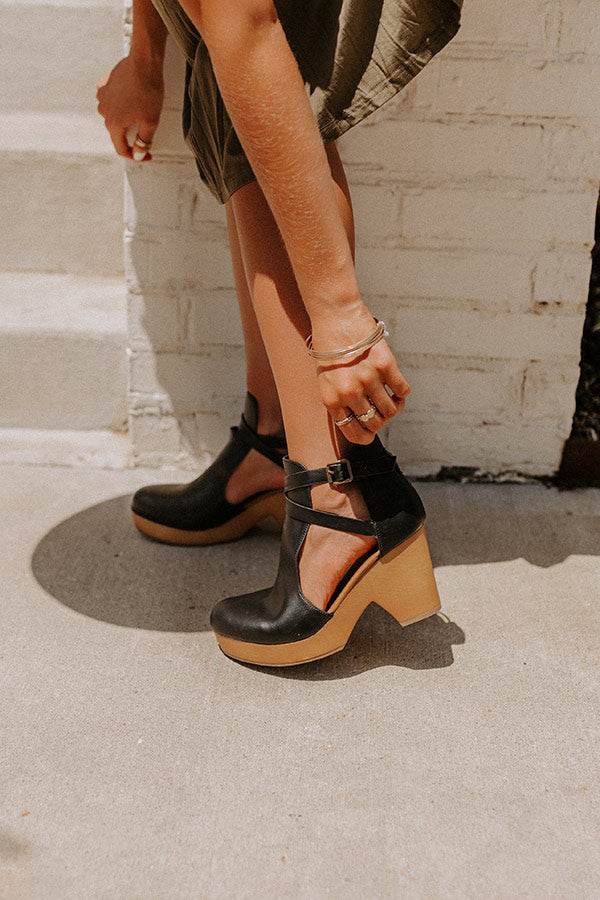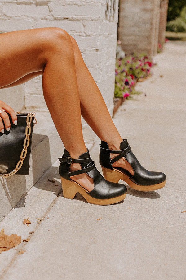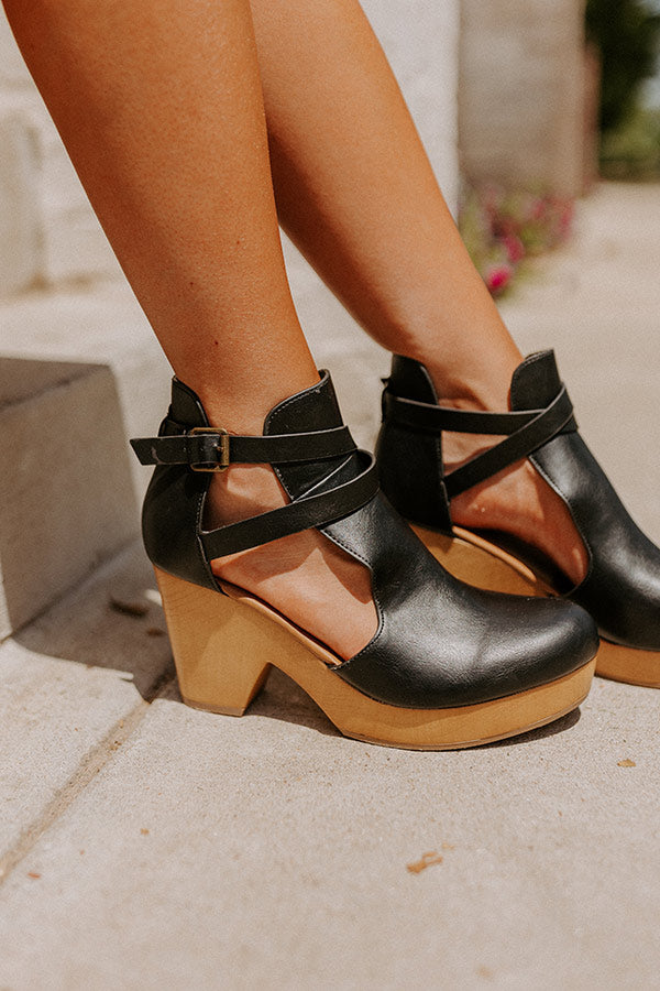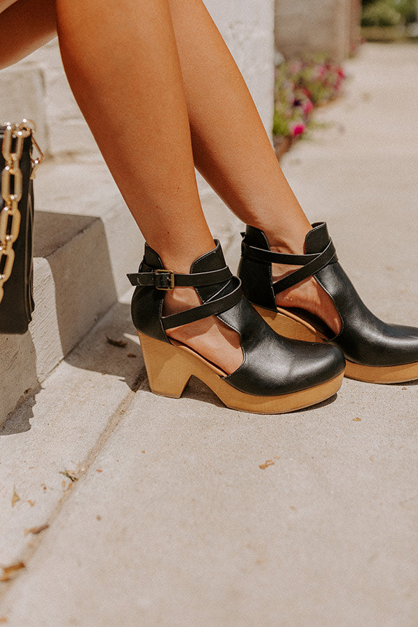 Boho and beautiful, our unique black 'Concord' heel features faux leather material, a rounded closed toe, a cutout silhouette on both sides, a 3.5-inch clog heel with a subtle platform sole, and a buckled ankle strap! This heel runs more true to size.