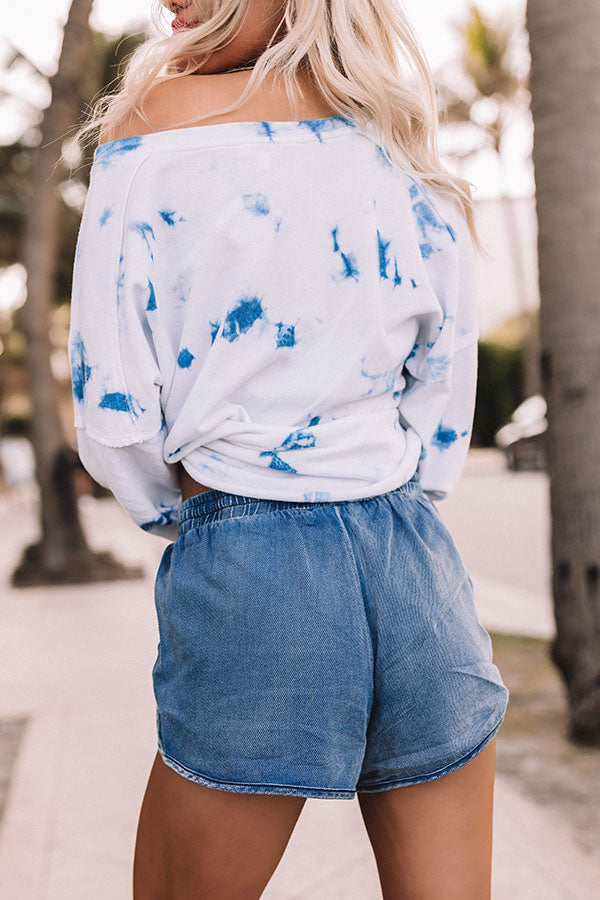 Upgrade your summer denim collection with our comfy and cute 'Cooper Shorts' featuring ultra lightweight light wash chambray material, a wide elastic waistline with a tie belt, and a relaxed silhouette that falls into rounded upper-thigh length hemlines! Measurements