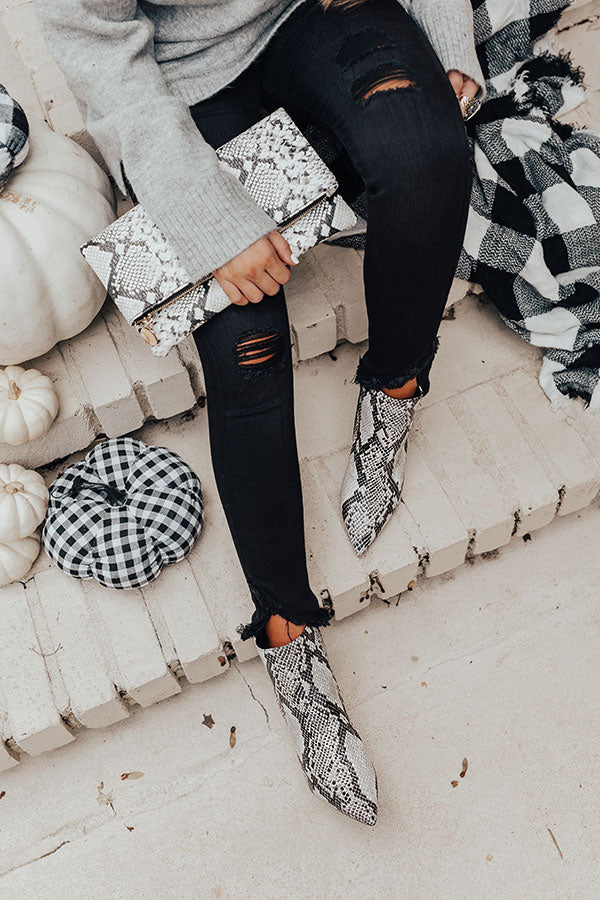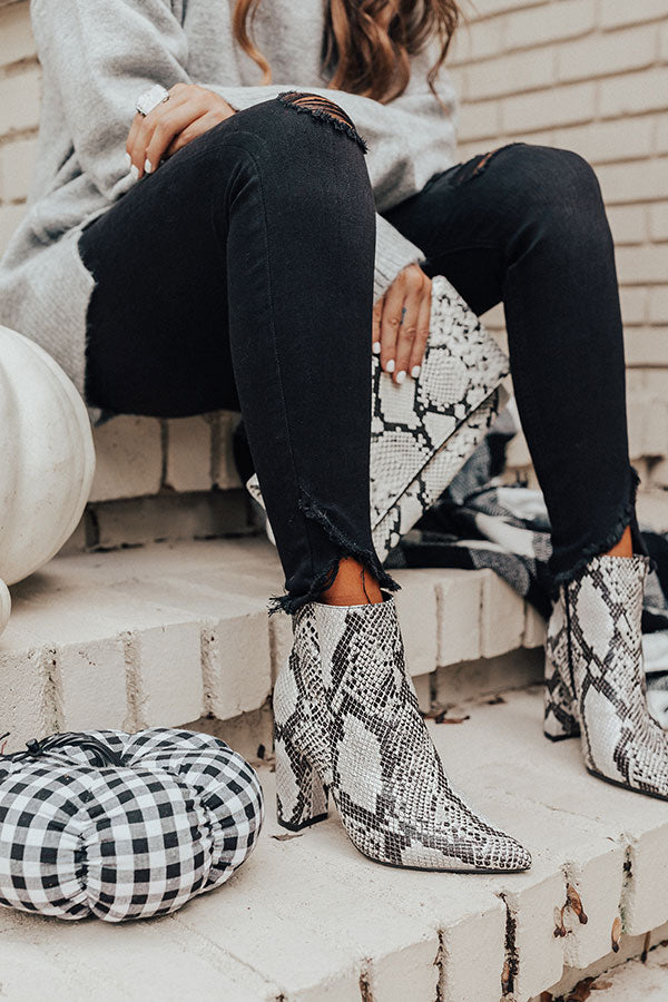 Take a walk on the wild side this fall with "The Cora" bootie featuring a faux leather black and white snake print pattern and texture, pointed closed toes, 3.5-inch block heels, an over-the-ankle fit, and inside zippers!