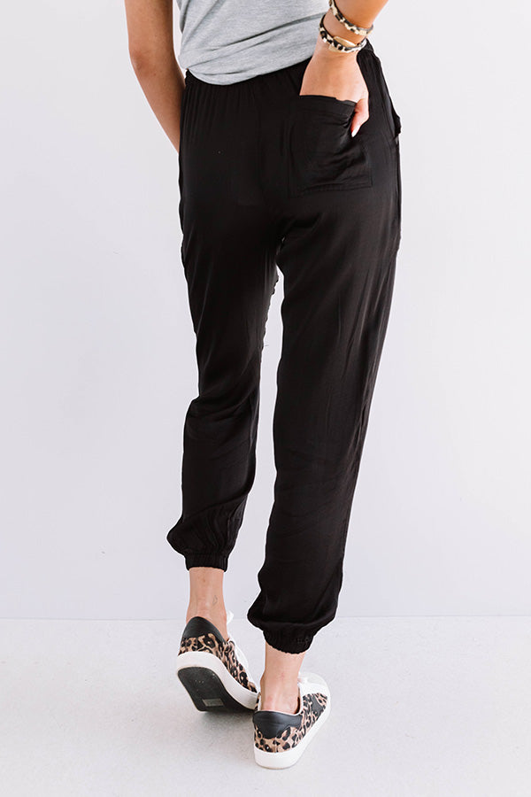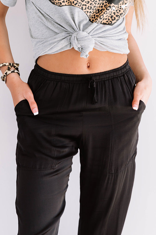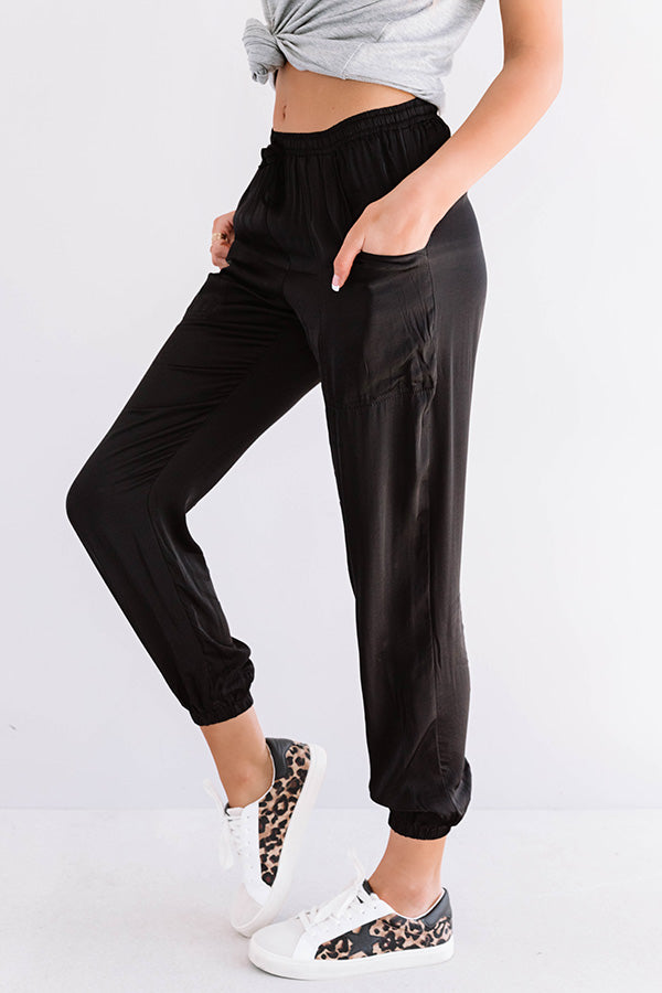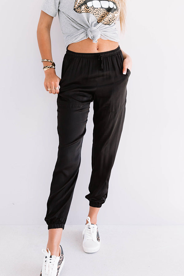 Stay chic AND cozy in our black "Corinna" joggers featuring sleek lightweight satin material, an elastic waistline with a tie belt closure, accent side and back pockets, and a relaxed pants silhouette that falls into fitted ankle length hemlines! You can dress these cuties down with a graphic tee and some trendy sneakers, but you can also style them up with a basic white tank layered under our "Fashions Latest Leopard Blazer," sunnies, "The Carolina Heel in Natural," and our "CEO Material Faux Leather Tote in Black!"
