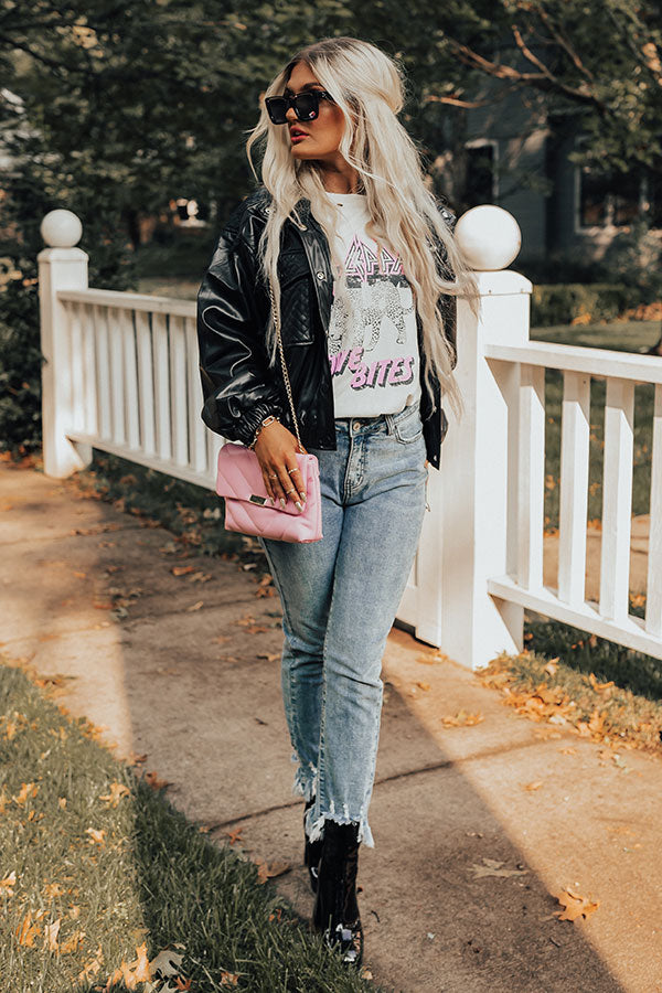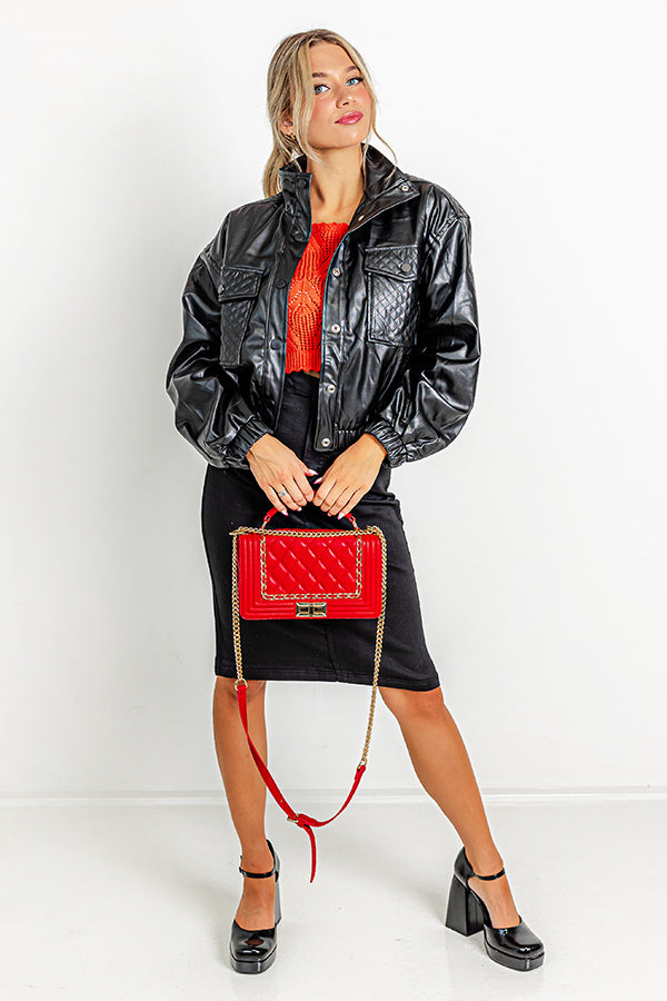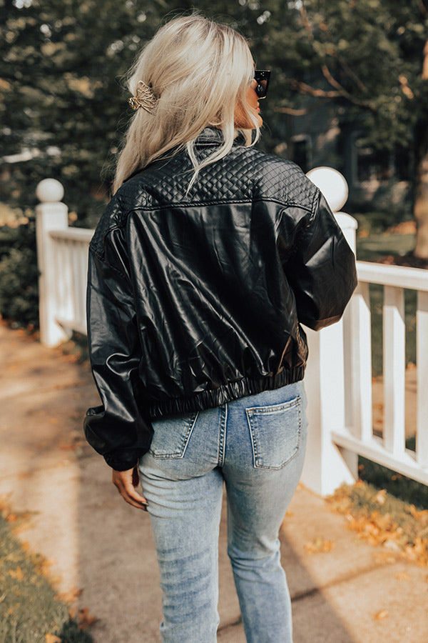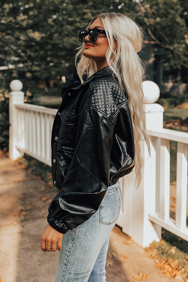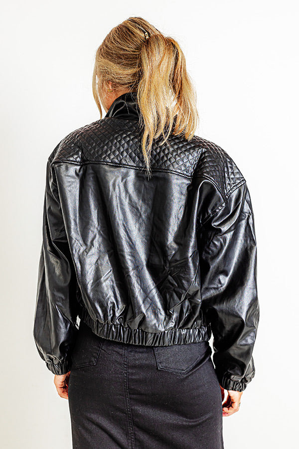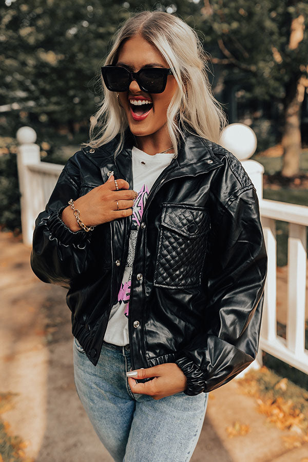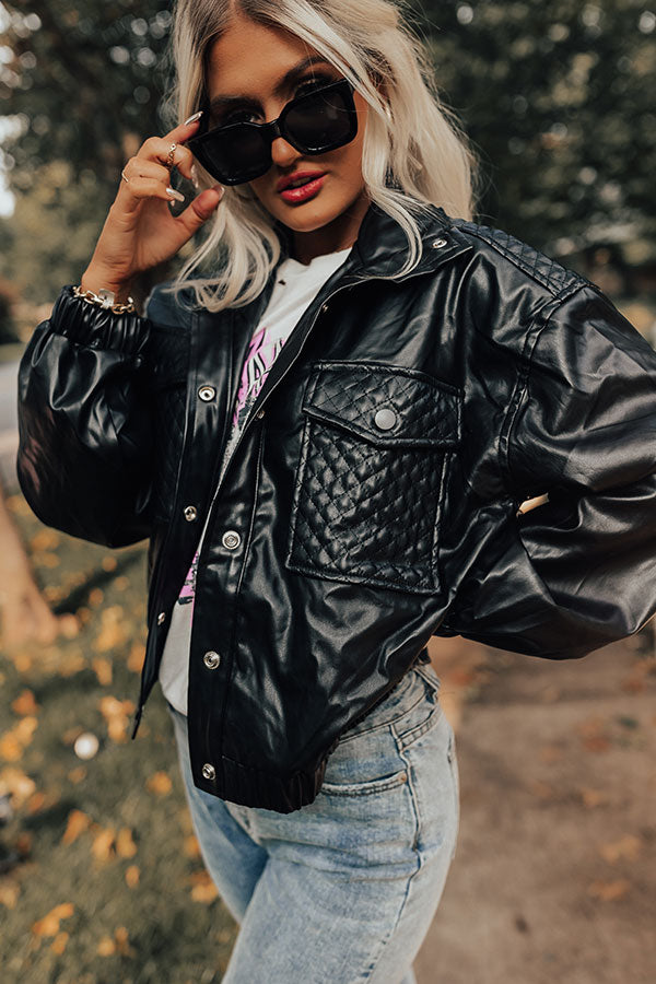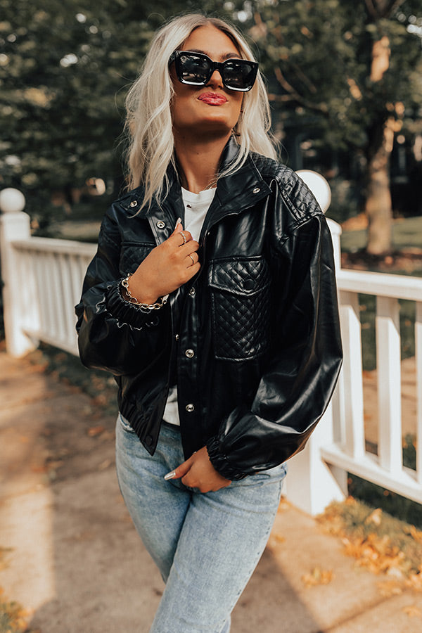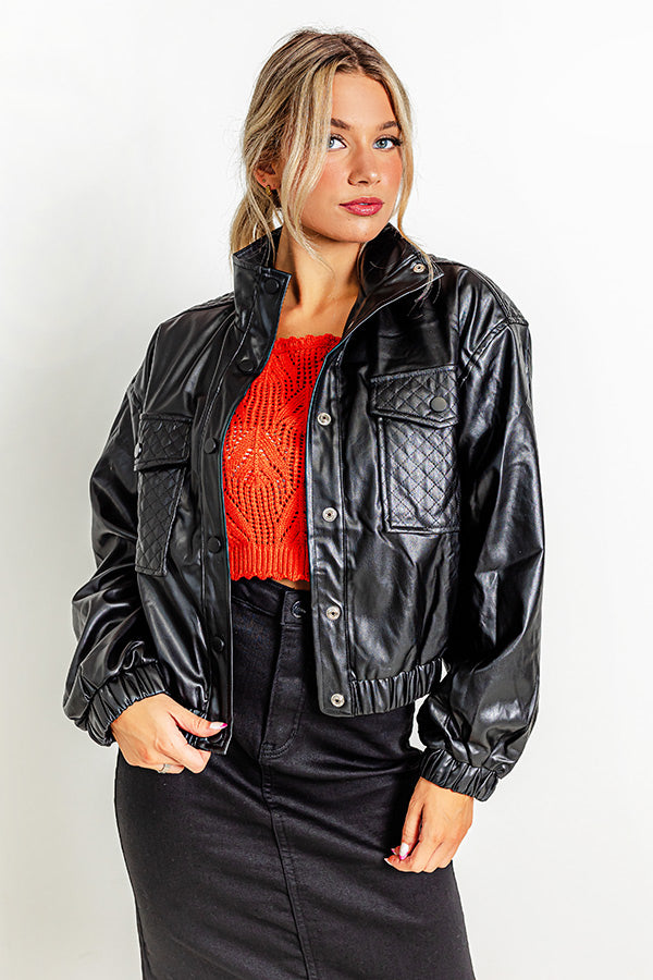 Our fave outerwear piece just landed! Our sleek black 'Crescent' jacket features faux leather material, a button down front with a collared neckline, quilted chest pockets with flap snap button closures, long loose sleeves with fitted cuffs, and a slouched bomber silhouette that ends in a straight hemline!