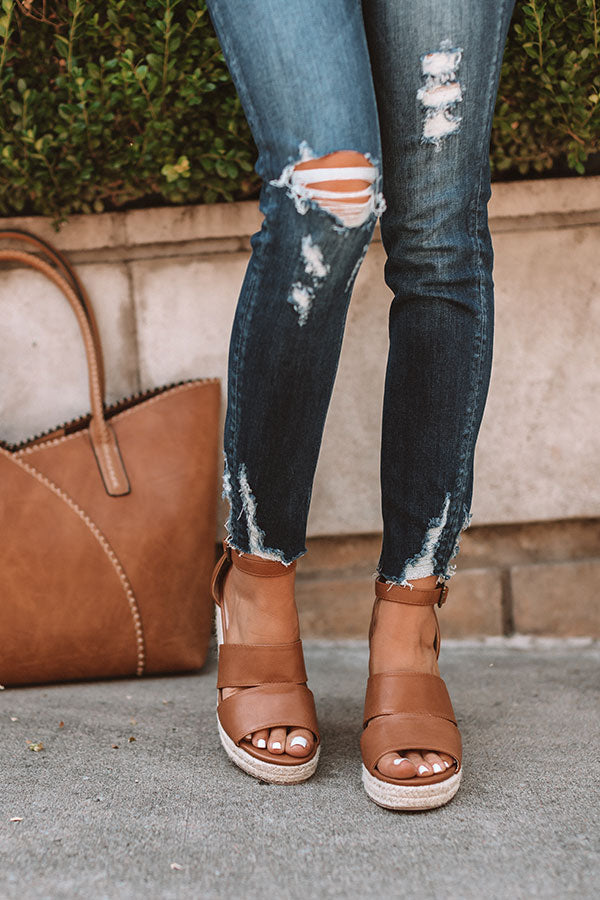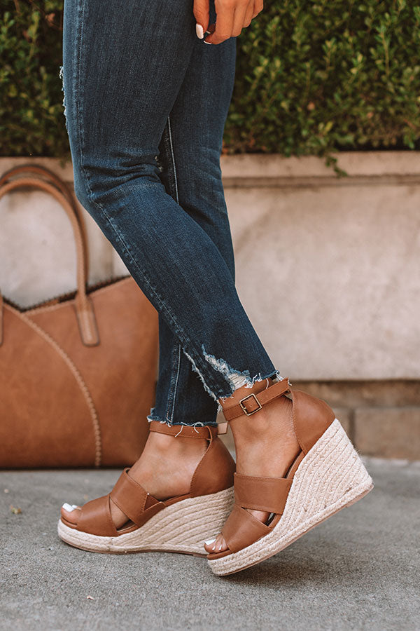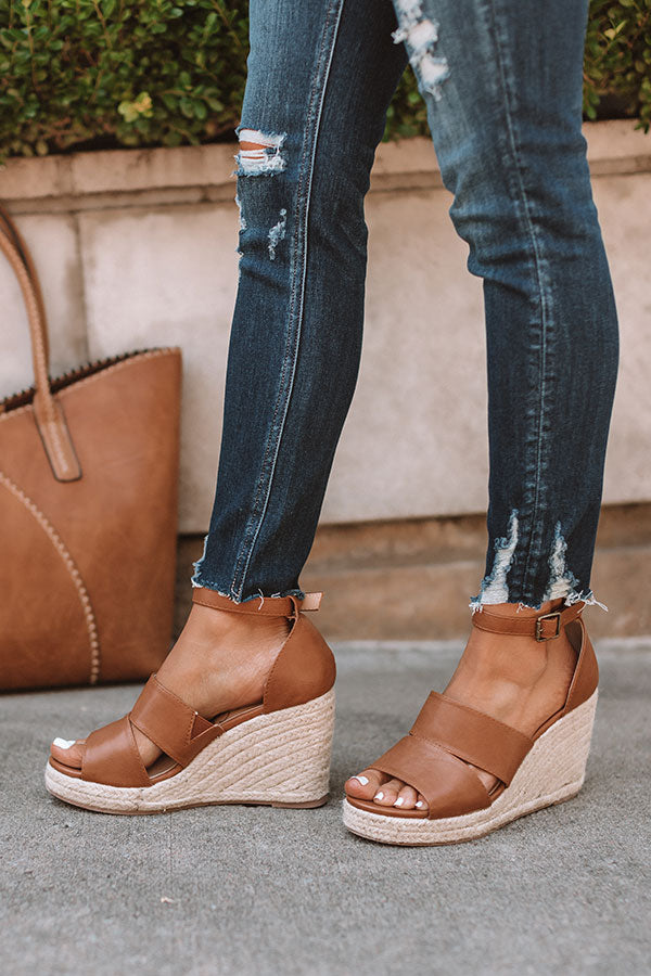 Shoes lift you up physically and emotionally, so put on these tan espadrille wedges that have two wide foot straps, an ankle strap with a buckle, and a 4 inch textured heel and you will feel like you are unstoppable!