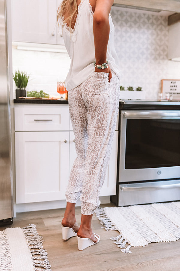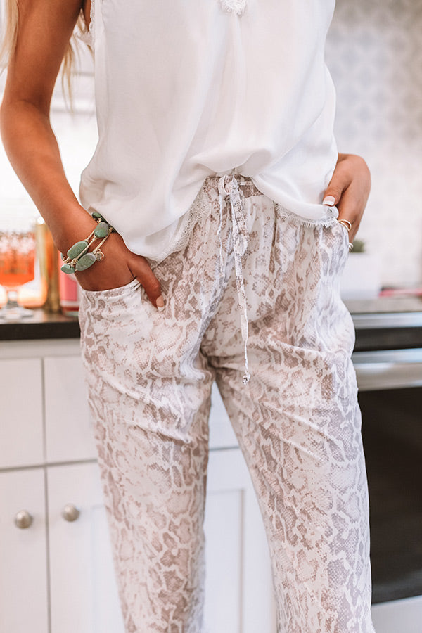 Strike a pose in our daring "Cyan" joggers featuring sleek lightweight material patterned with a neutral hued snake print, an elastic waistline with a tie belt closure, accent side and back pockets, and a relaxed pants silhouette that falls into fitted ankle length hemlines! We have styled these flirty bottoms with a white satin tank and clear wedged mules, but you can also wear it with our "Kiss And Tell Bodysuit in Brown" under a cropped jean jacket with "The Ainsley Sneaker," sunnies, and our "A Moment's Crossbody in Warm Taupe!" Measurements