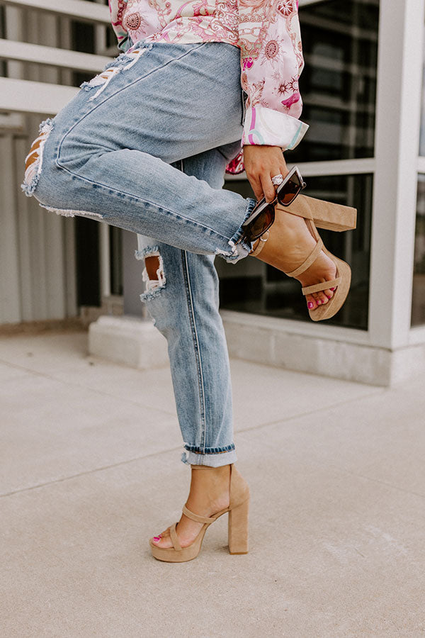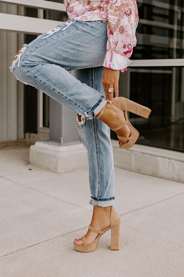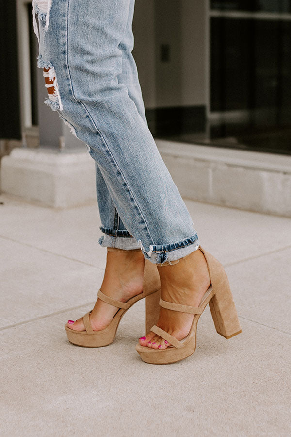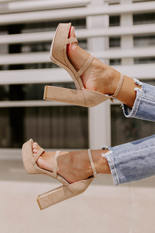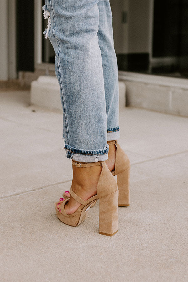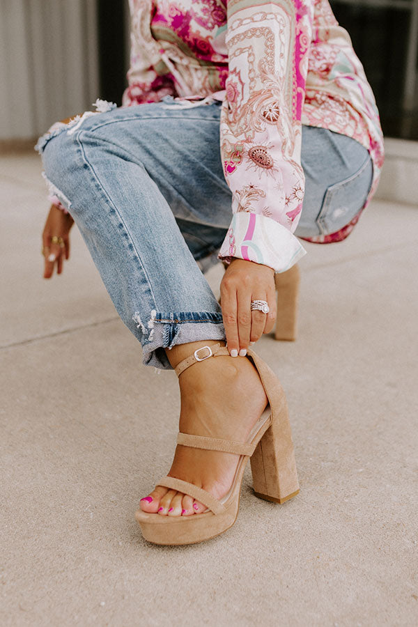 Keep your heels and standards high with our pretty iced latte colored 'Daisy Jane' heel featuring faux suede material, two skinny over-the-foot straps, a rounded open toe, a 5-inch block heel with a platform sole, and a closed heel with a buckled ankle strap! This heel runs more true to size.