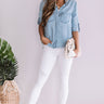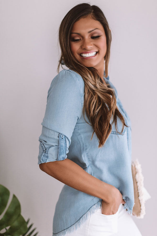 In a world full of trends, keep your look classic with "The Dakota Chambray Top!" This chambray top has a collared neckline, long roll-tab sleeves, a button-down bodice with front accent pockets & a frayed high-low hem with a split back hem. Style with your favorite white denim & wedges for a timeless look with a cute & casual twist!
