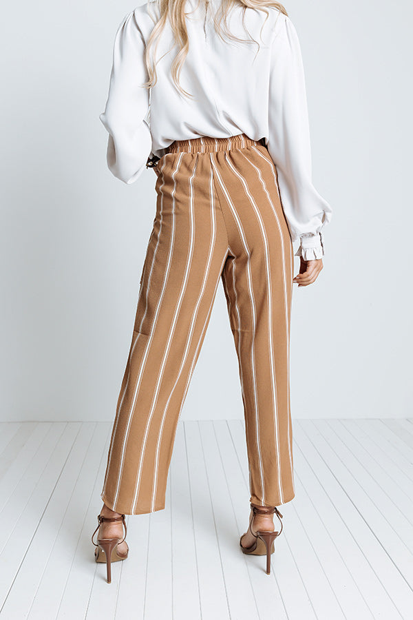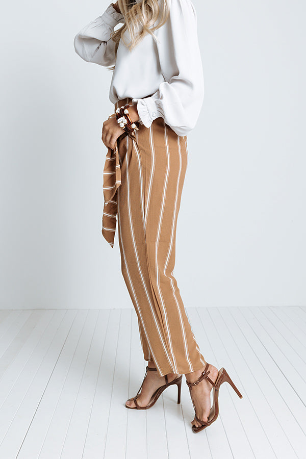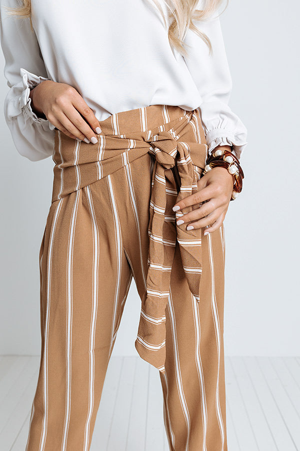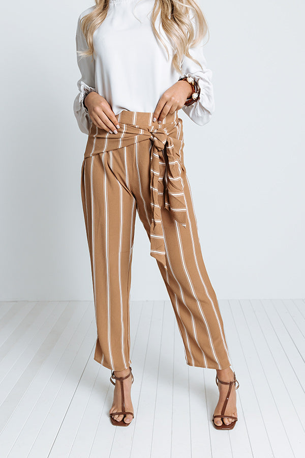 People are sure to envy your office style when you complete your look with our cute khaki hued 'Dasha' trousers featuring lightweight material patterned with white vertical stripes, a flirty waistline with a tie accent, and a chic silhouette that falls into ankle-length hemlines! Measurements
