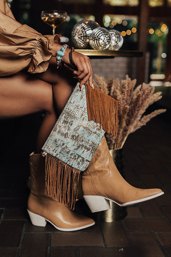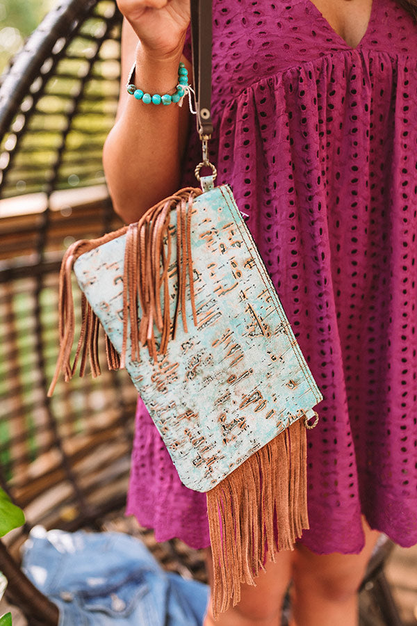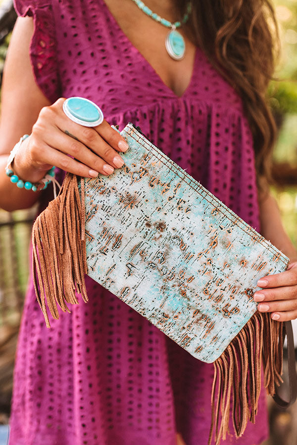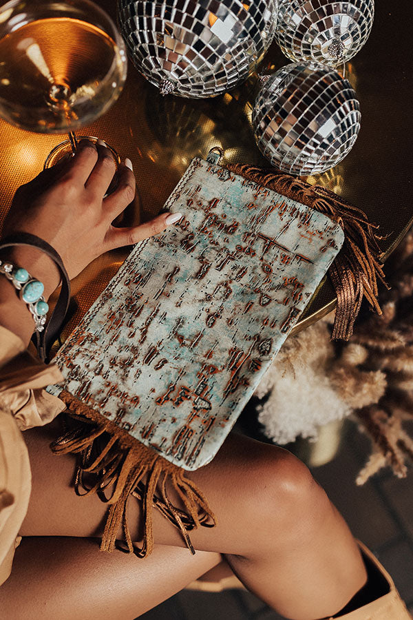 Tie your OOTD together in the best way with our stunning "Delilah" clutch featuring sleek leather rustic light blue hued material, oversized fringe side detailing, a removable wrist strap, and a lightweight but spacious rectangular pouch with a zip closure!
