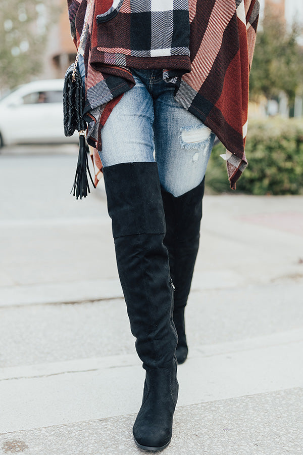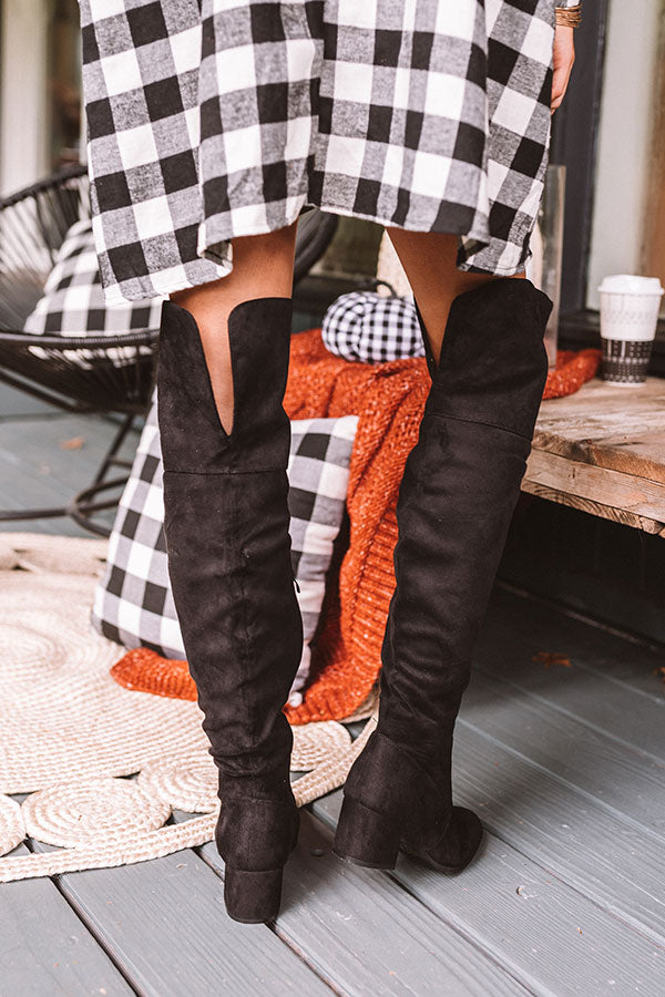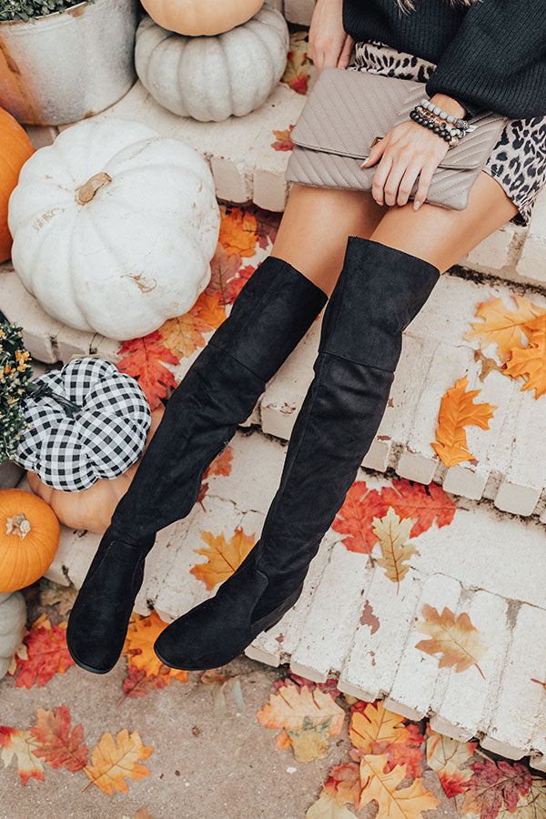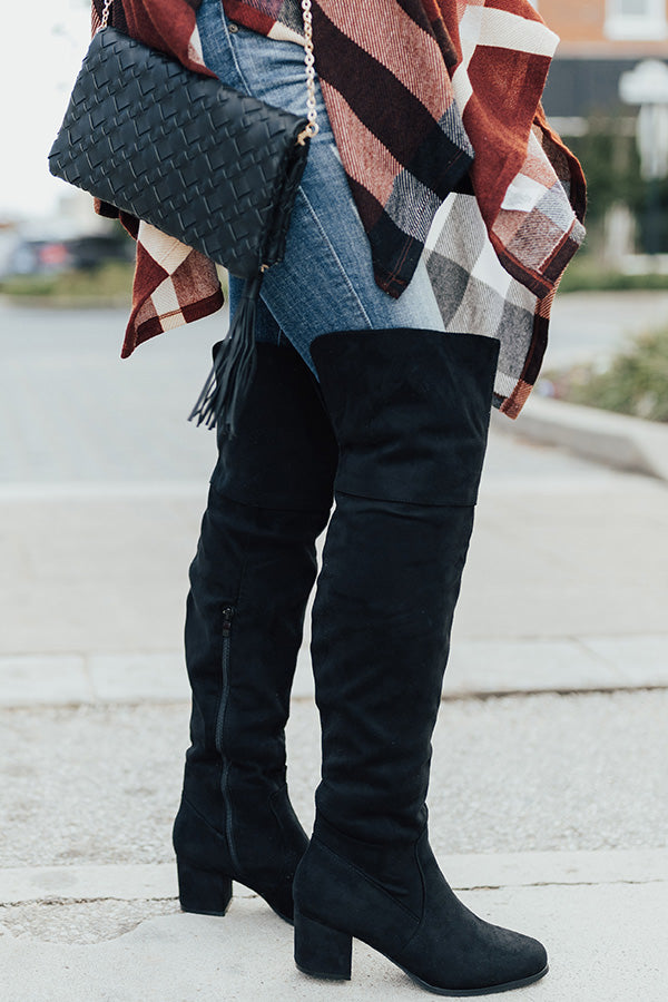 These boots were definitely made for walking! The black "Diana" shoe features a soft faux suede material, rounded closed toes, 2.5-inch block heels, a thigh high fit with split center seams, a 24-inch height, and a 15-inch calf width!