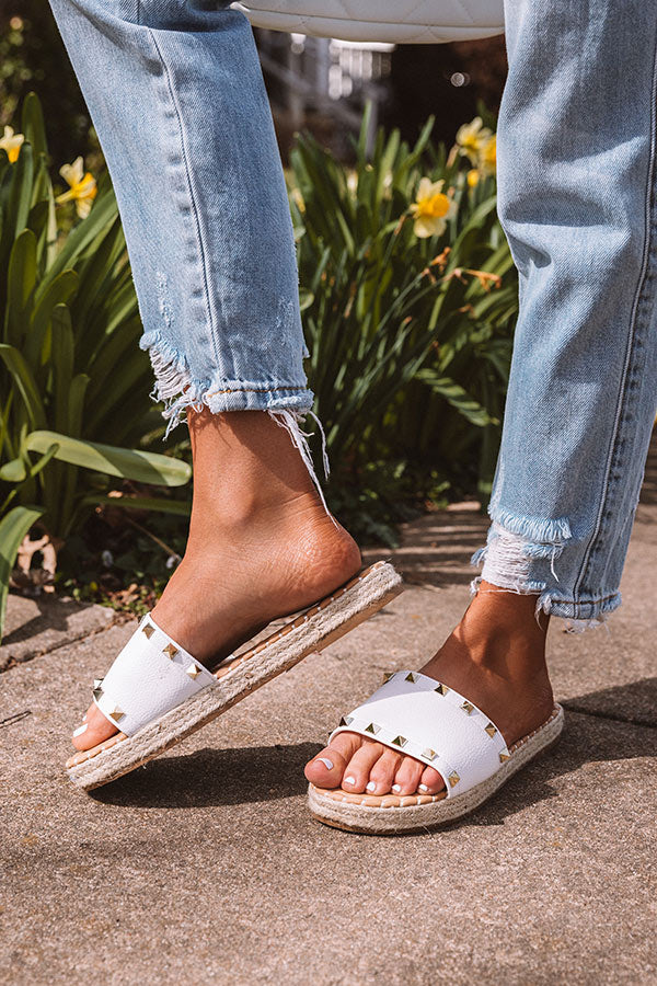 Slide into summer effortlessly with our trendy 'Dollie' sandal featuring a wide white faux leather over-the-foot strap with gold stud trim detailing, a rounded open toe, and a lightweight slip-on silhouette! This sandal runs more true to size.