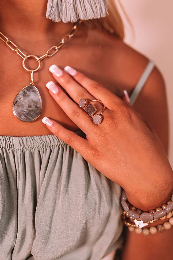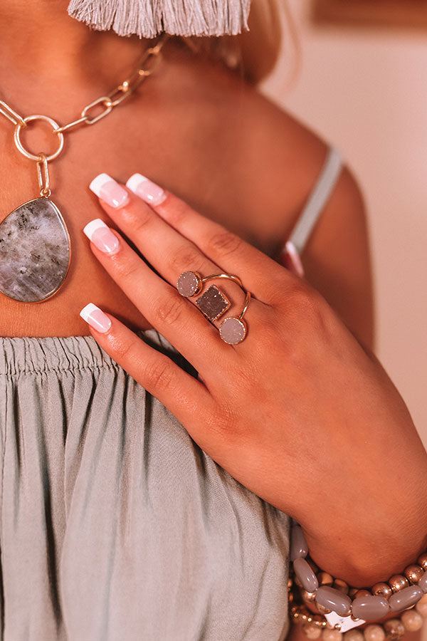 Add a beautifully bold statement to any look by accessorizing with the stunning "Dottie" ring featuring a gold wrap band with three brown hued druzy stones! Due to the use of natural stones, stones may vary in size, shape or color.