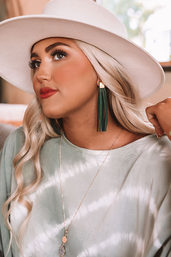 The 4-inch "Elaine" earrings feature emerald colored hand cut North American genuine leather tassels hanging from 18kt gold plated with nickel free processing cuff studs with LuxLock™ ear back for comfort and security!