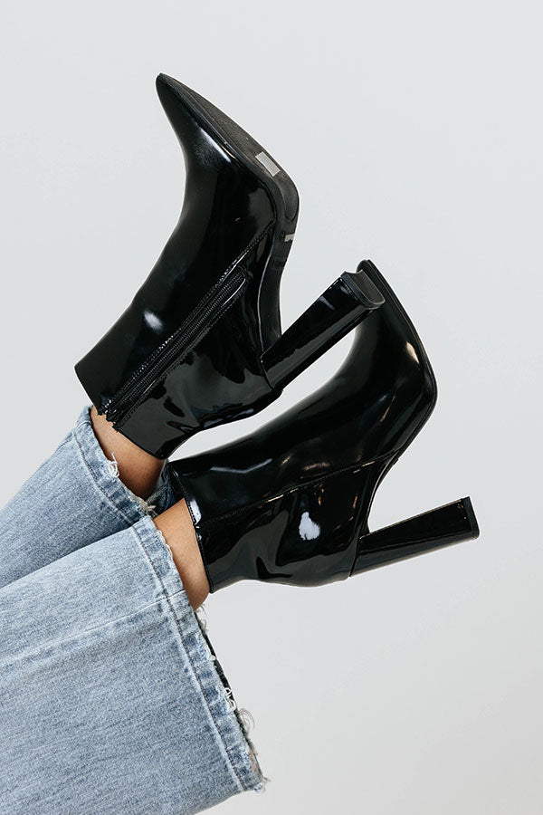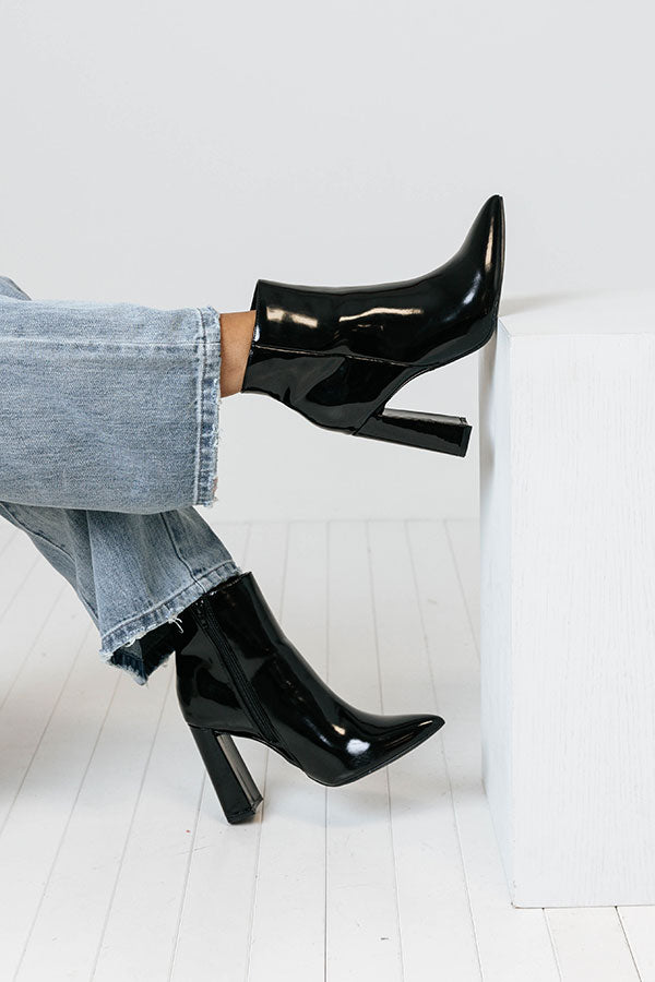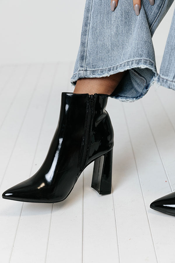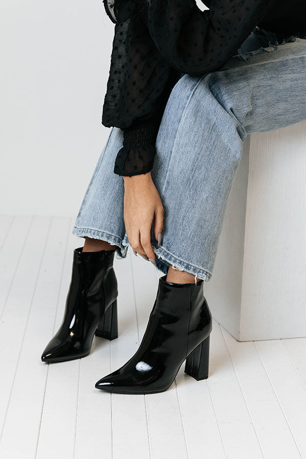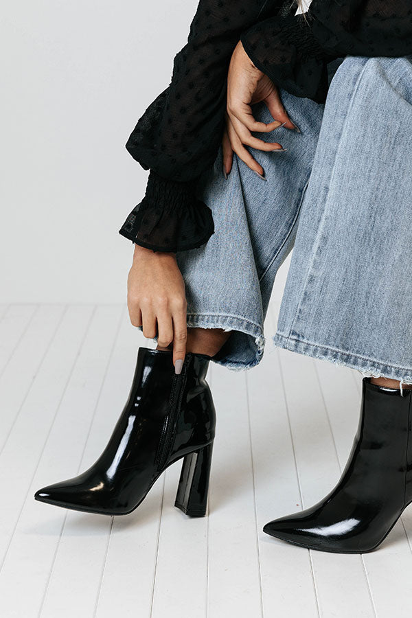 People are sure to be envious of your shoe game when you complete your look with our black 'Eldora Patent Bootie' featuring sleek material, a pointed closed toe, a 4.2-inch block heel, an inside ankle zip closure, and a chic over-the-ankle silhouette! This patent bootie runs more true to size.