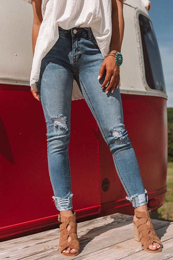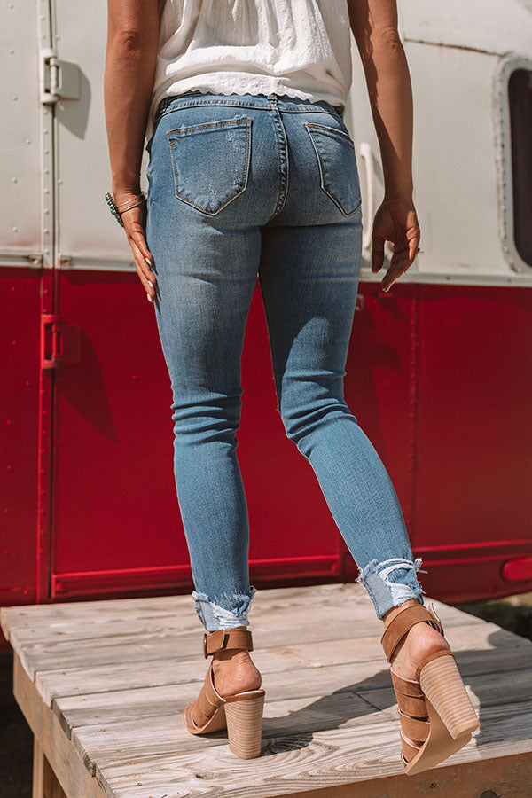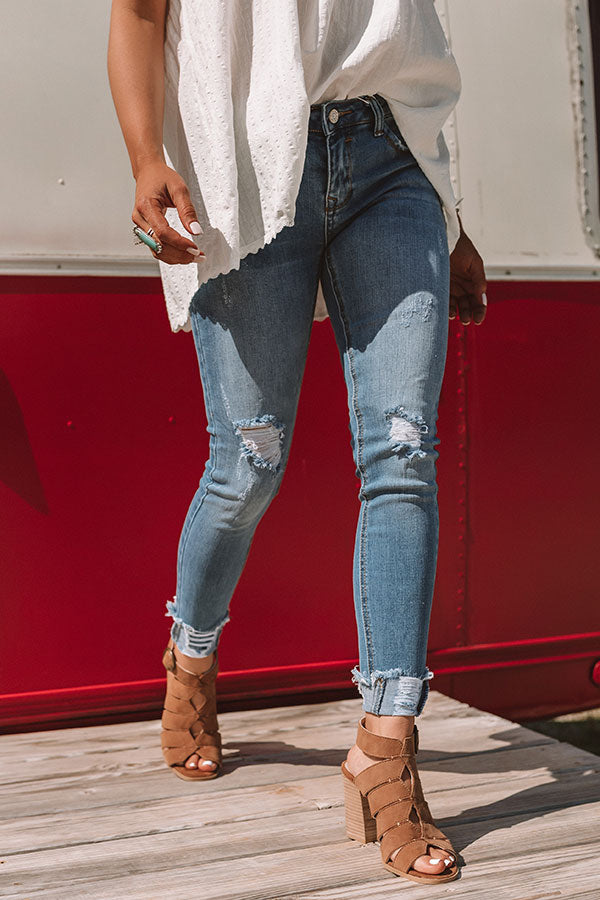 Who says you can't wear skinny jeans in warm weather? These are the perfect mid rise skinny jeans with medium wash denim and distressed knees and cuffs! They include belt loops with a hidden zip fly, button closure, and five pocket cuts! Pair with some cute wedges or sandals for the ultimate summer pants style! Measurements