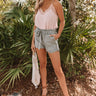 These high waisted denim shorts have a ruched elastic waistline with a sash tie belt, side pockets, back pockets & a cuffed hem.