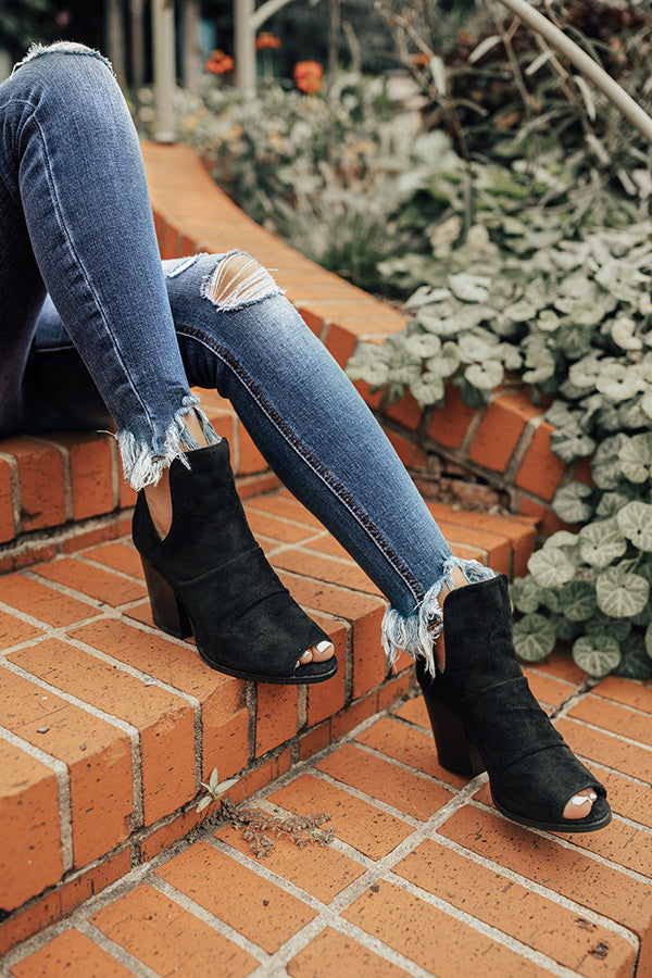 As Shown. Heel Height: 4 inches black faux suede peep toe ankle bootie with v-cut sides & a block heel.