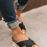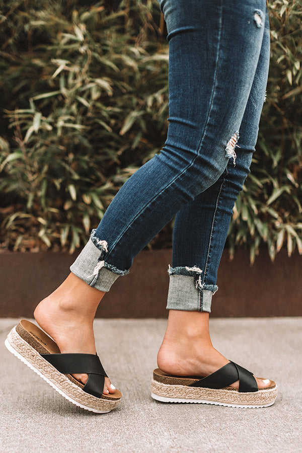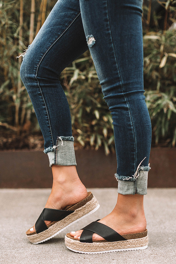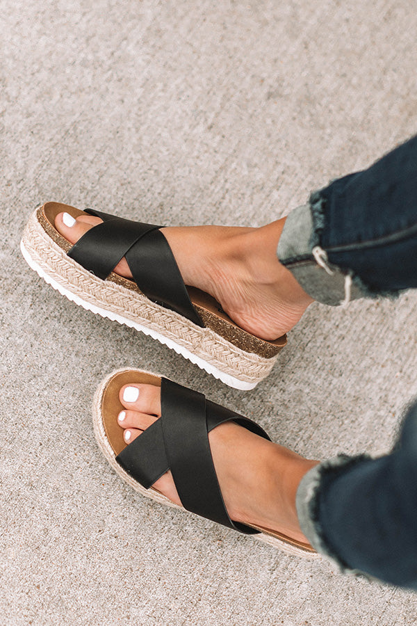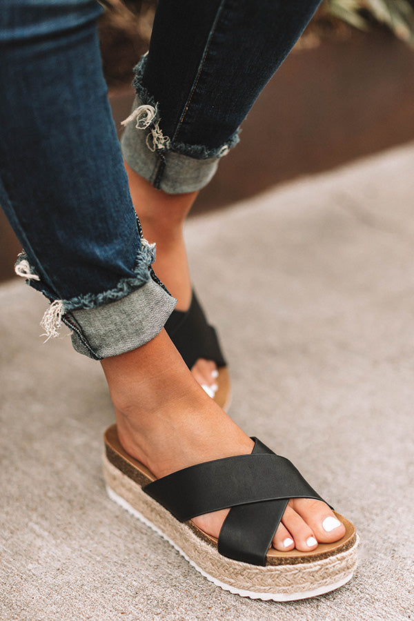 Slide into summer in style with our black"Emmy Espadrille" featuring lifted 2-inch soles with braided texturing, wide criss-crossed over-the-foot straps, and a slip on, open toe silhouette!