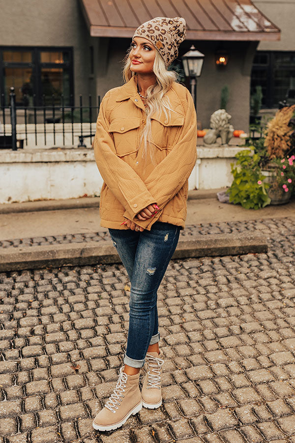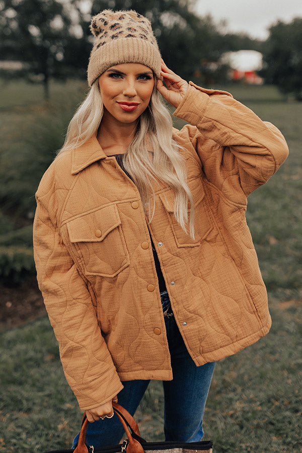 Being cold won't be an issue when you layer up with our camel colored 'Enna Jacket' featuring thick quilted material, a button up front with a collared neckline, long loose sleeves with button closure cuffs, two side pockets and two accent chest pockets with flap closures, and a relaxed silhouette that falls into a straight hemline!