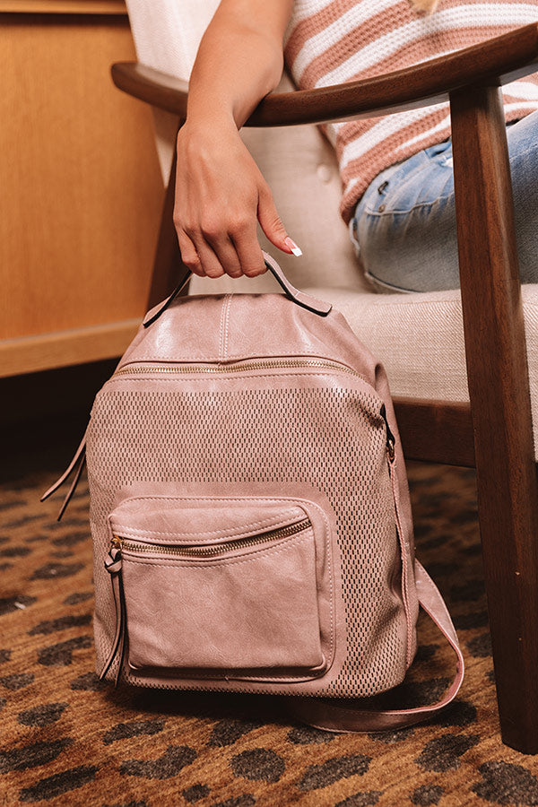 This stylish blush colored backpack is a closet "essential" with its sleek faux leather material with perforated detailing, an accent front and back pocket with zip closures, one tote handle on the top, two adjustable shoulder straps, and a spacious pouch with another zip closure!