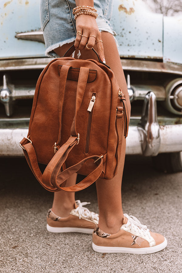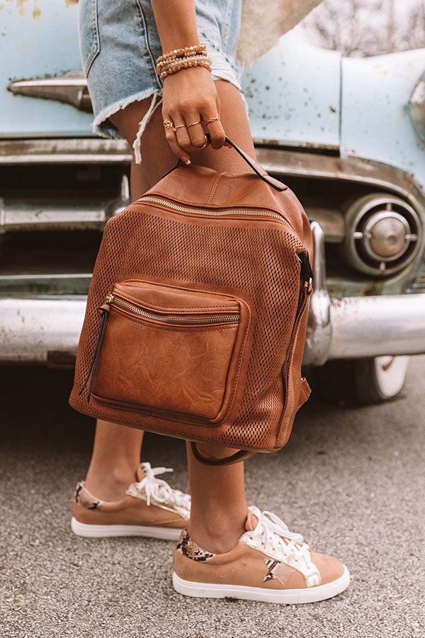 This stylish maple colored backpack is a closet "essential" with its sleek faux leather material with perforated detailing, an accent front and back pocket with zip closures, one tote handle on the top, two adjustable shoulder straps, and a spacious pouch with another zip closure!