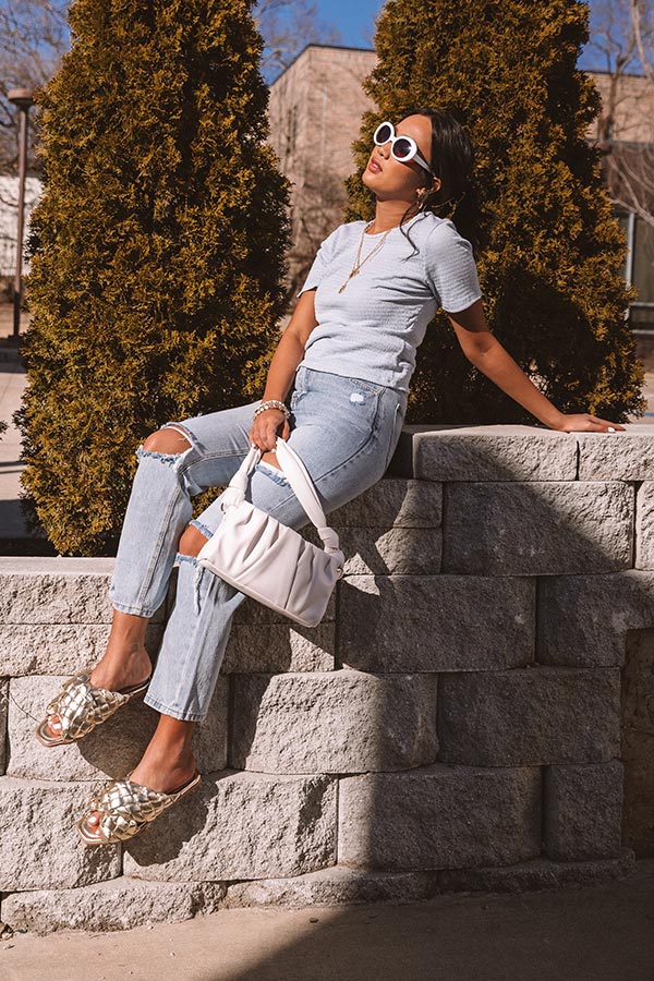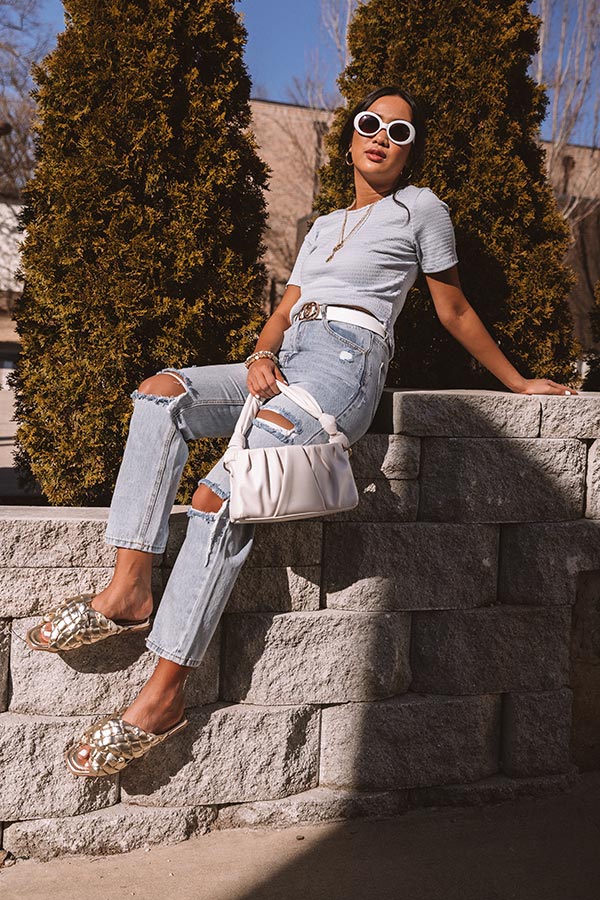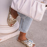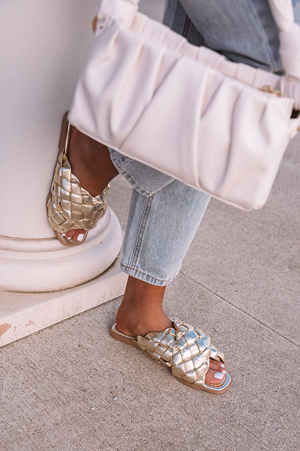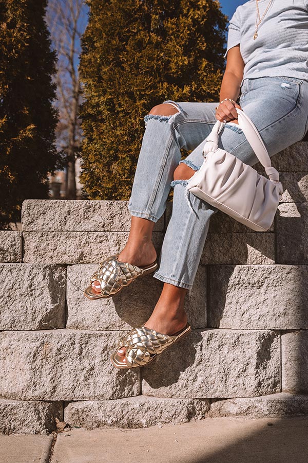 Meet our favorite new spring sandal! The 'Essie' in gold features two wide braided straps that cross over-the-foot, a square open toe, a flat sole, and a lightweight slip-on silhouette! This sandal runs more true to size.