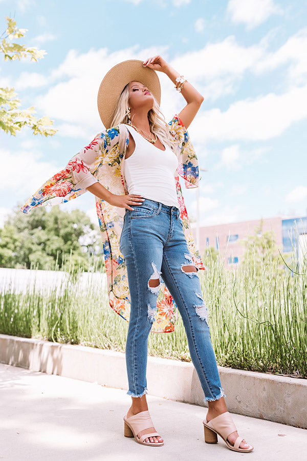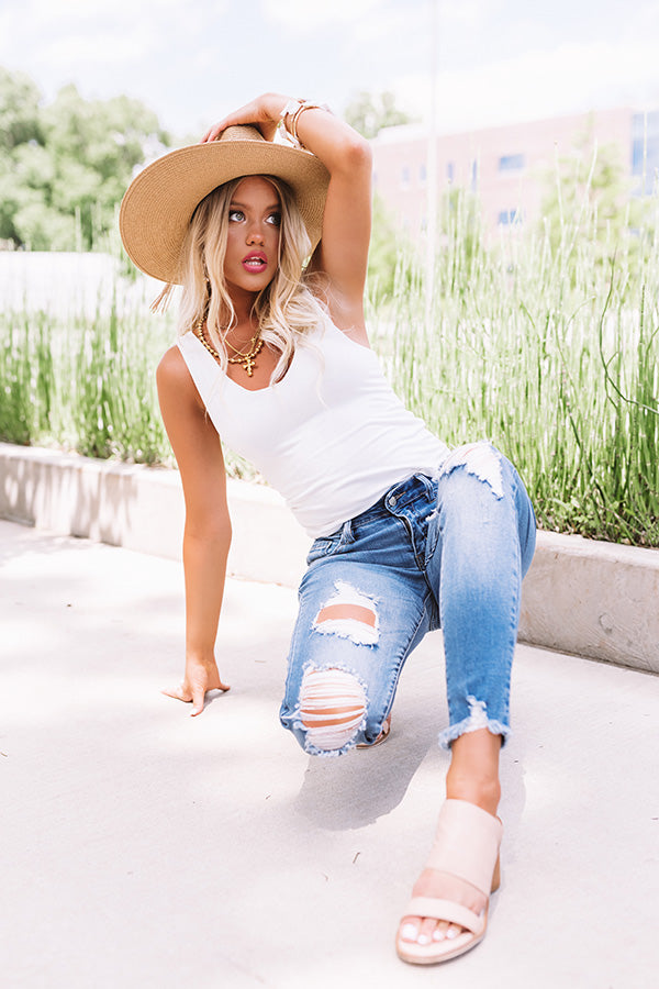 Life is more than just fitting into your jeans, but we believe you will LOVE the feel and look of "The Etta" skinnies with their lightweight medium wash denim material, high waist with belt loops, distressed detailing, 5 pocket cuts, a hidden zip with a button closure, and a form fitting silhouette that falls into frayed ankle-length hemlines that can be cuffed! These trendy bottoms will take you from season to season when you wear with your favorite open toed heel and tank top in the summer and with booties and a sweater in the fall!