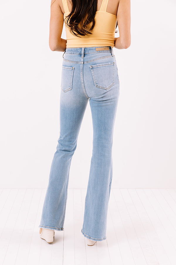 Stay groovy this summer with 'The Ettison' flares featuring lightweights stretchy material, a high waistline with loops, a light wash color with accent fading, subtle distressed detailing, and