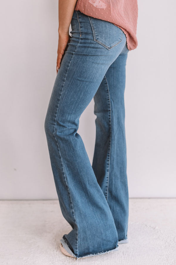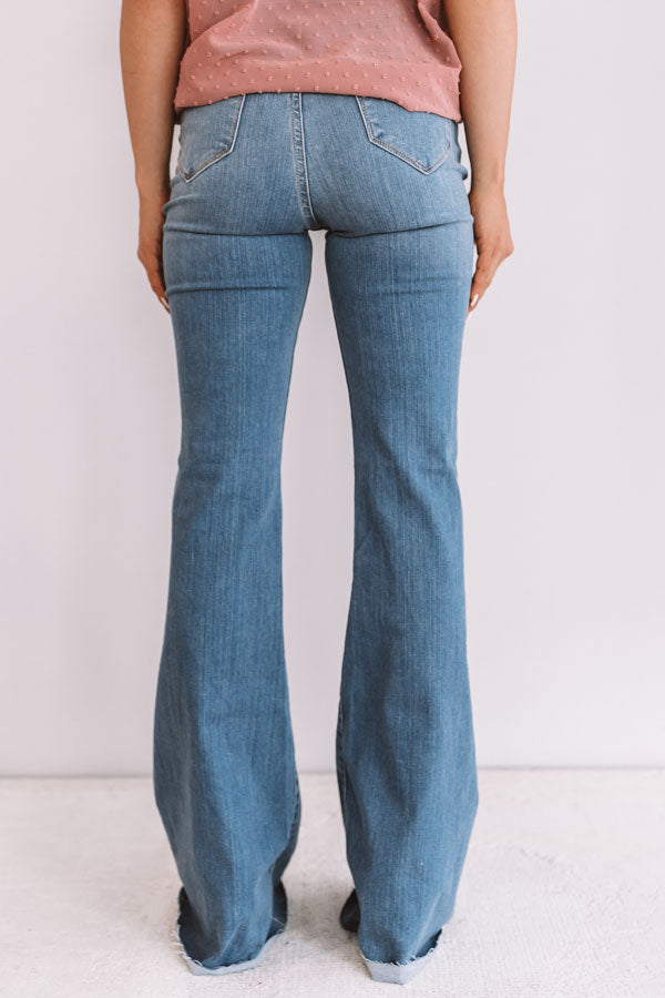 Stay groovy through all four seasons in these medium wash flares with their high waist fit, stretchy fit, distressed knees, five pocket cuts, belt loops, and hidden zip with a button closure! Strut in these fabulous bottoms all year round when you wear with your favorite strappy sandals or open toed heels in the summer and with booties or closed toed wedges in the fall! Measurements