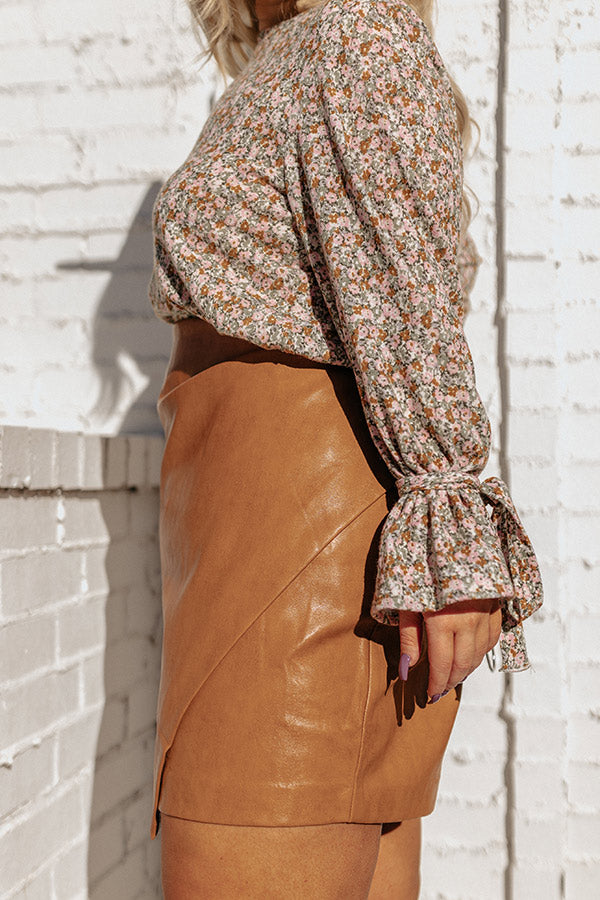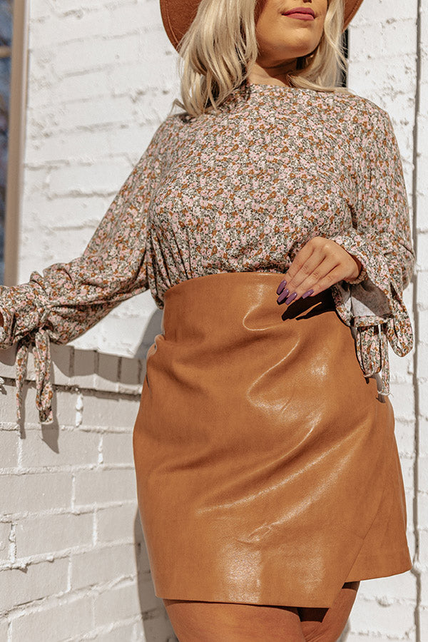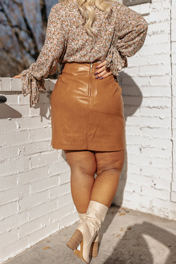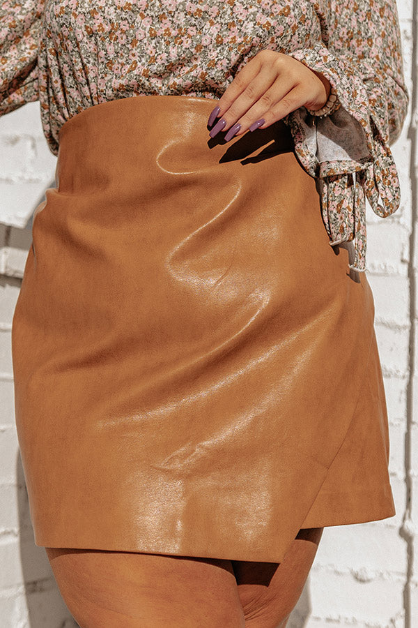 Transition from season to season with ease in our chic camel hued plus size 'Fabina' skirt featuring sleek faux leather material, a zip closure back, and a faux wrap front with an asymmetrical mid-thigh length hemline! Measurements