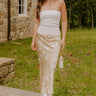 - This fabulous satin midi skirt is pure magic with its flowing shape and dreamy print! Every step feels a little sweeter in this standout piece. - Unlined material with a gold and ivory floral print and a satin finish - An elastic waistband - A relaxed and flattering silhouette that ends in a straight, midi length hemline