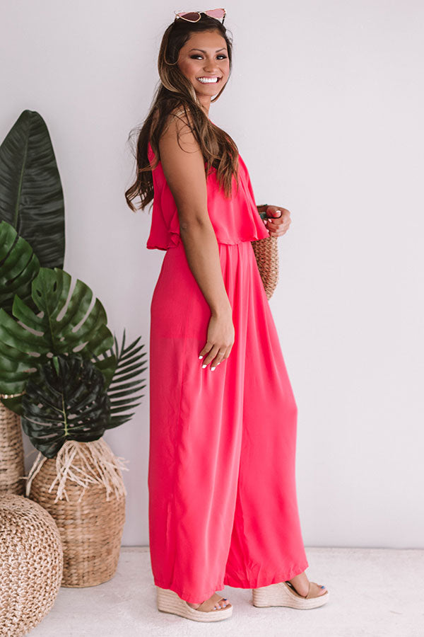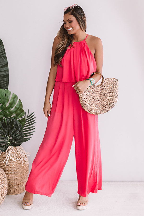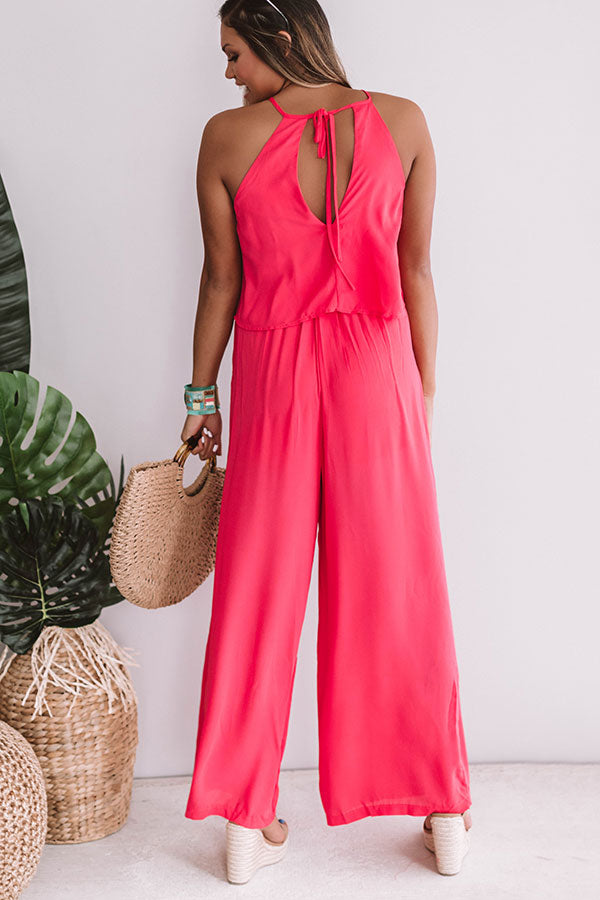 No matter where the night takes you... Go with the flow in "The Fashion Week Jumpsuit!" This chic jumpsuit has a flirty flounce bodice that carries over into a keyhole cut-out racer-back, an elastic banded waistline & an ultra flowy wide-cut pant. Take your look to the next level with a sassy block heel & a colorful statement earring!