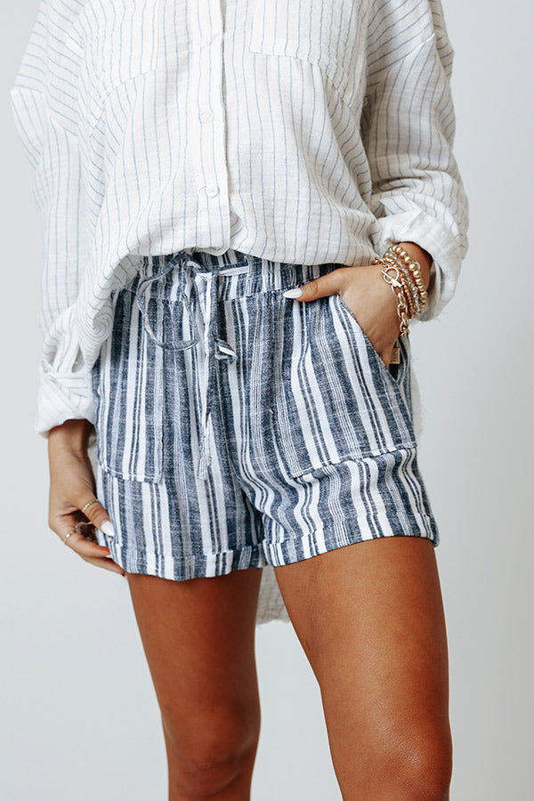 'Stripe' a pose in our classy white 'Felton' shorts featuring lightweight material patterned with vertical blue accent stripes, a tie closure waistline, accent front pockets, and a relaxed silhouette that ends in straight cuffed upper-thigh length hemlines! Measurements