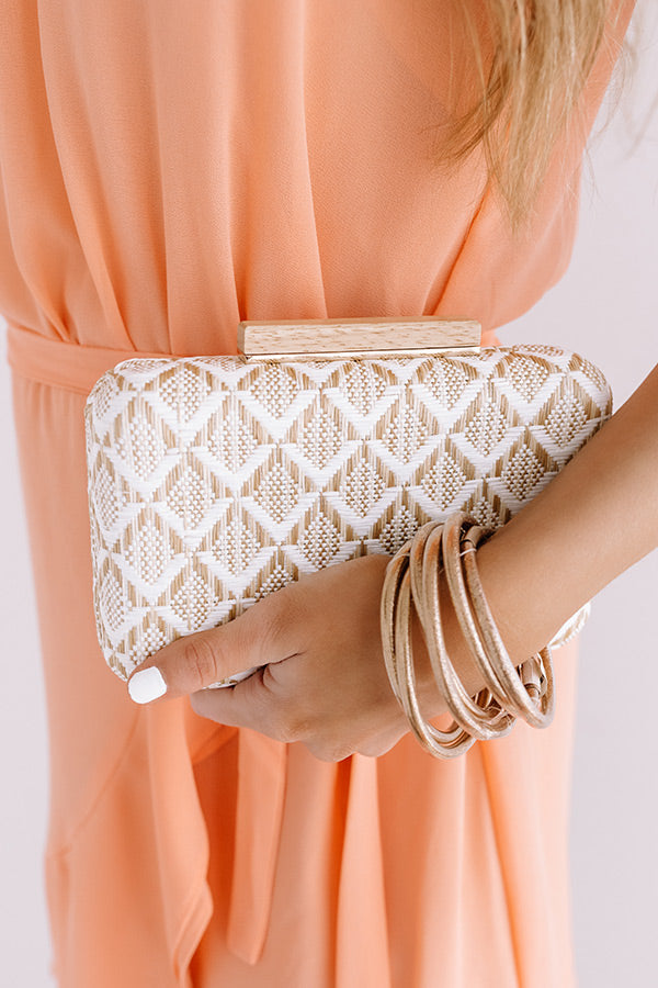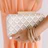 This chic clutch is the perfect "final touch" to your OOTD with its tan and white intricately woven checkered pattern, a horizontal gold bar closure, and a spacious hard shell pouch!