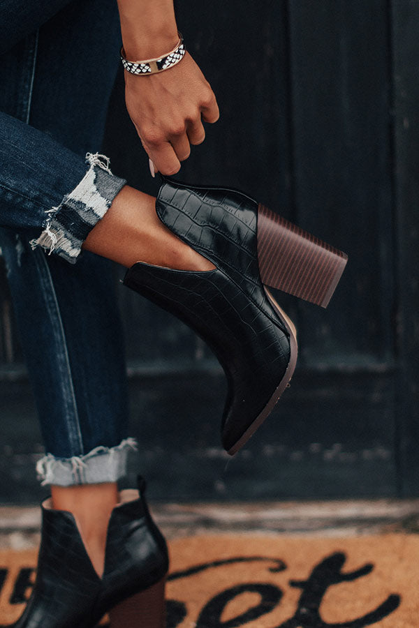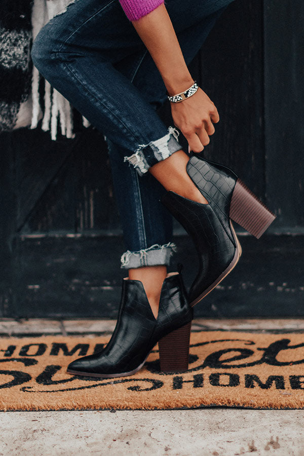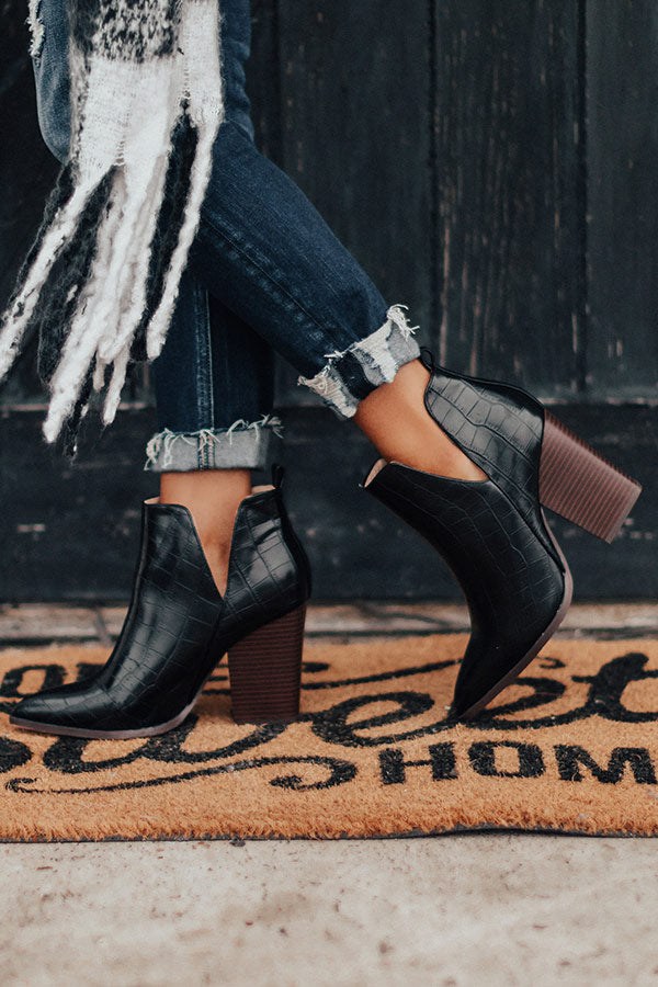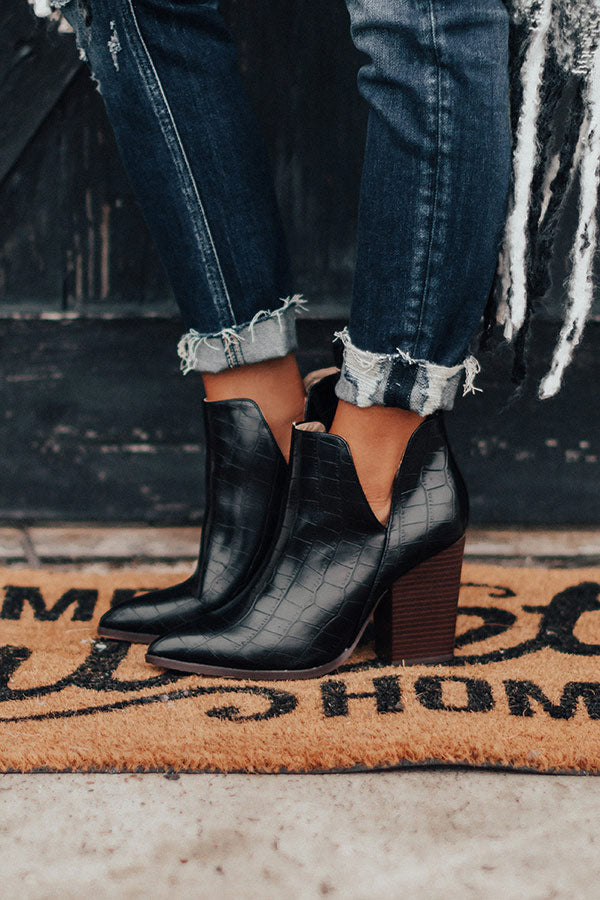 Take a walk on the wild side in our black "Florence" bootie featuring sleek faux leather material patterned with a gator skin print, inside and outside v-notches, pointed closed toes, 4-inch block heels, and an ankle height fit!