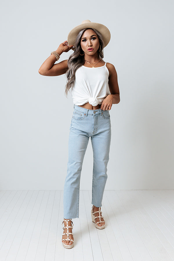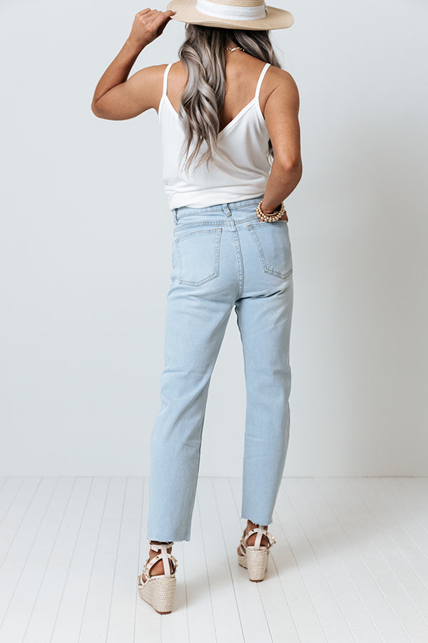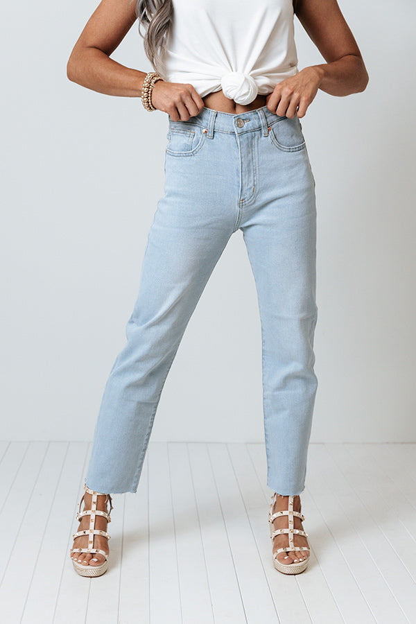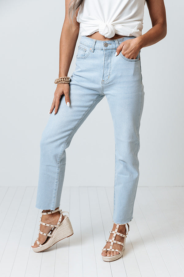 Our new fave summer denim just dropped! The timeless 'Fraiser' jean features lightweight light wash denim material, a high waistline with belt loops, a classic five pocket cut, a hidden zip fly with a button closure, and a relaxed but flattering silhouette that falls straight into raw-cut ankle-length hemlines!