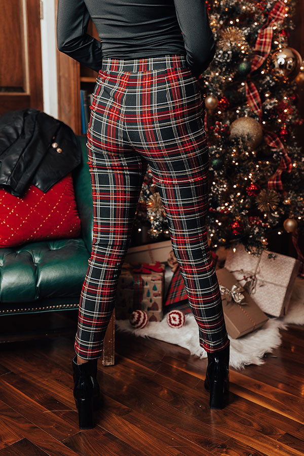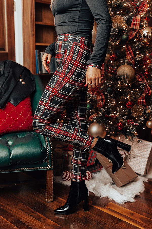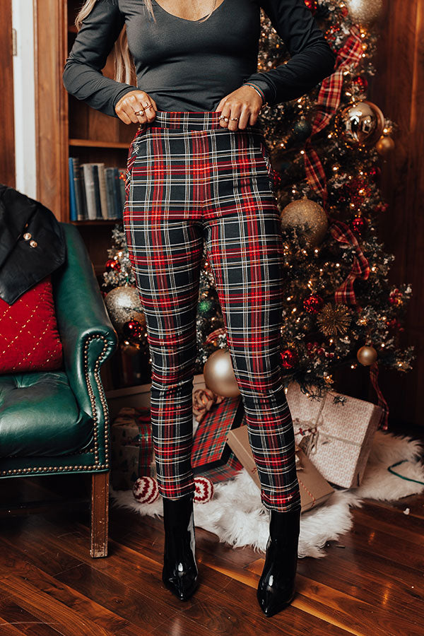 Make your holiday look extra chic with our sophisticated black 'Frampton' pants featuring lightweight material patterned with a red and white plaid print, a high waistline, and a flattering figure hugging silhouette that falls into ankle-length hemlines! Measurements