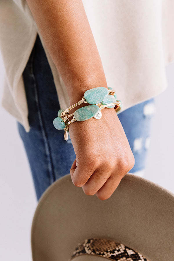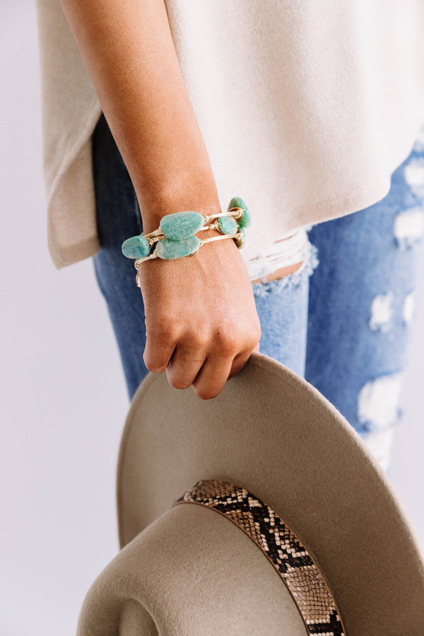 The "Ginna" bracelet features a gold plated copper wire-wrapped bangle adorned with three natural stones!