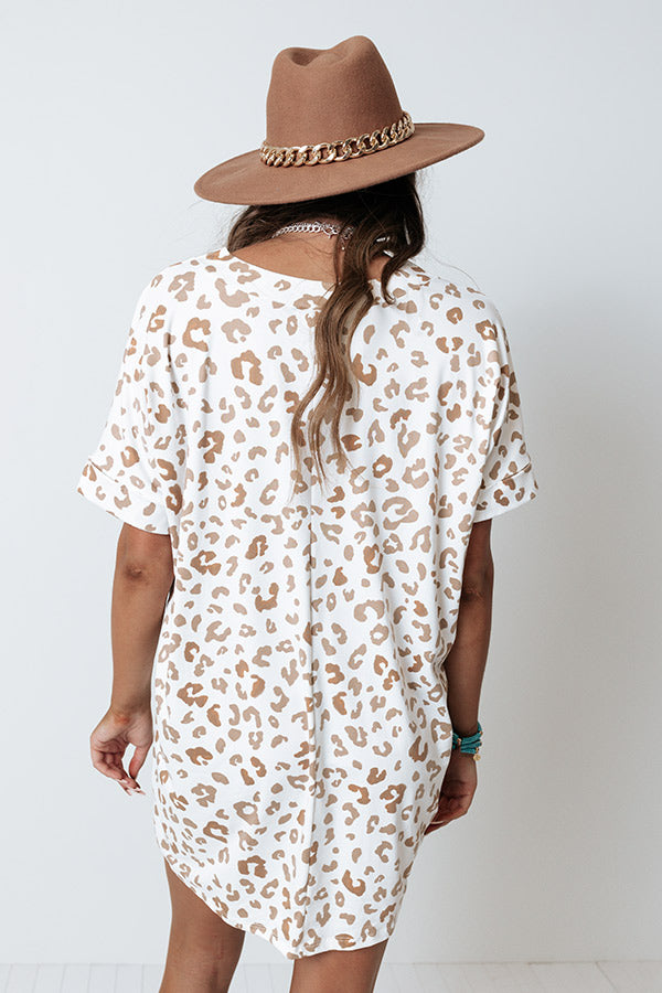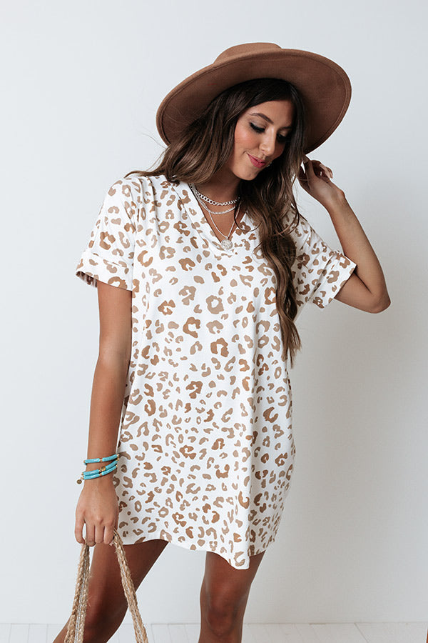 You will undoubtedly be the girl of the hour when you arrive in this casual ivory shift dress featuring soft lightweight material patterned with a large natural hued leopard print, a rounded neckline, short sleeves, and a slouched silhouette that ends in a straight mid-thigh length hemline!