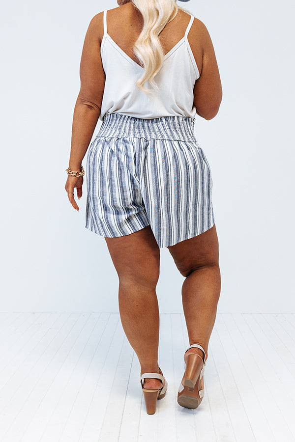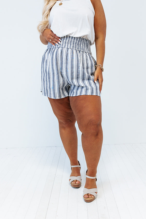 You are sure to be filled with glee when you complete your look with these adorable plus size shorts featuring lightweight material, vertical blue accent stripes, a high elastic waistline, and a relaxed silhouette that ends in straight upper-thigh length hemlines! on products Measurements