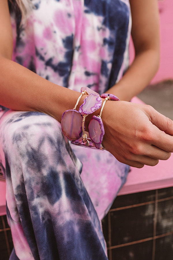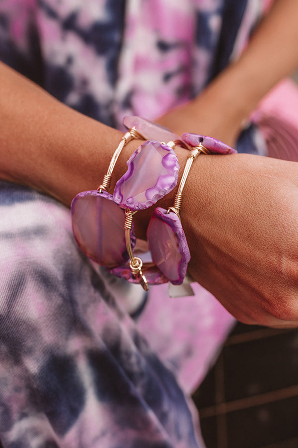 The "Grimes" bracelet features a gold plated copper wire wrapped bangle adorned with three agate stones!